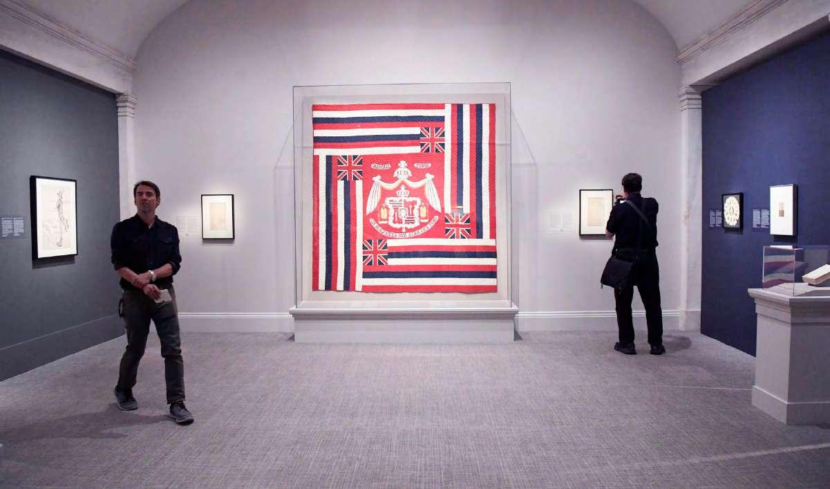 Personas caminan frente a la obra ‘Mi amada bandera hawaiana’ realizada por Rosina Kalanikauwekiulani Ayers.