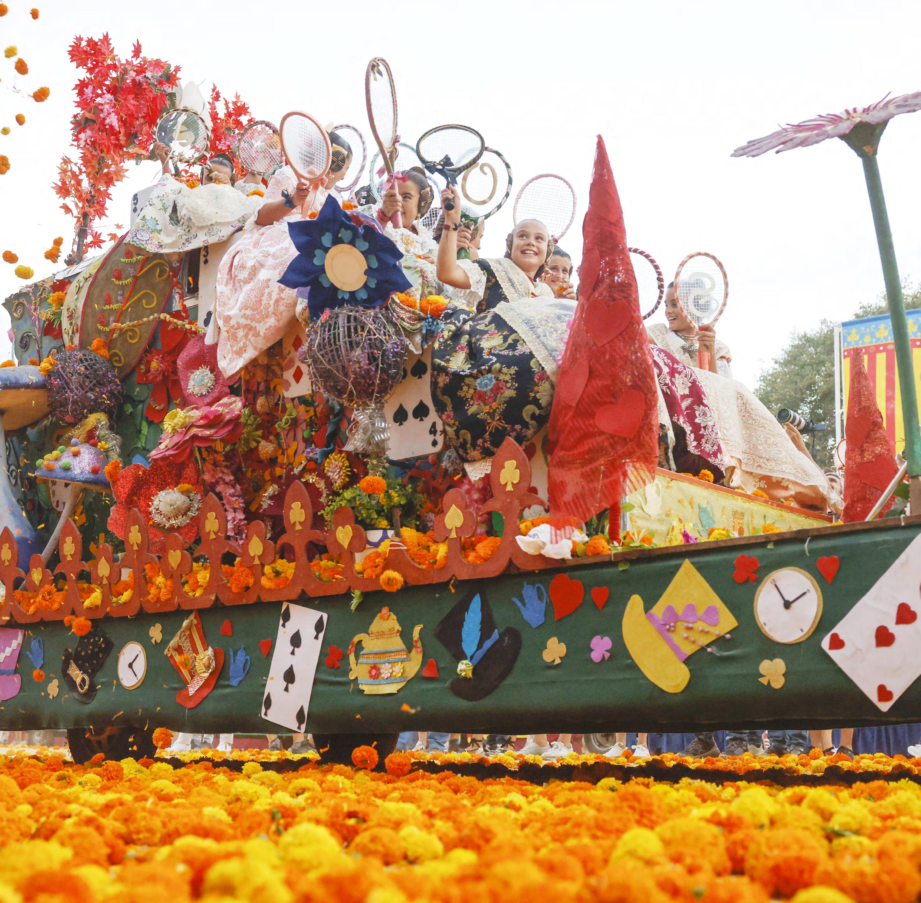 Cerca de 1,3 millones de clavelones naranjas y amarillos inundaron este 28 de julio de 2024 el Paseo de la Alameda de València en la Batalla de Flores, para la que unas 15.000 personas se inscribieron a través de la web creada para el evento. EFE