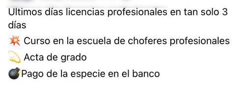 “Usted me hace el depósito e in mediatamente nosotros le enviamos todos los requisitos que necesita para empezar con el trámite de la licencia ”, menciona el oferente.
