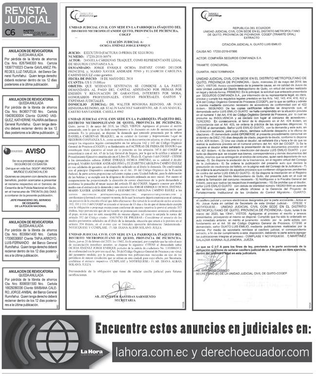 UNIDAD JUDICIAL CIVIL CON SEDE EN LA PARROQUIA QUITUMBE DEL DISTRITO METROPOLITANO DE QUITO, PROVINCIA DE PICHINCHA DE PICHINCHA. Quito, jueves 16 de febrero del 2023, a las 16h45. VISTOS: Agréguese al proceso el escrito presentado y las certificaciones emitidas por el Ministerio de Relaciones Exteriores presentados por la parte actora.- En lo principal, por haberse dado cumplimiento a lo dispuesto en auto que antecede, DISPONGO: CITACIÓN POR LA PRENSA: Atendiendo lo solicitado por la parte actora, a fin de citar por la prensa a la demandada: PASTUÑA QUINDIGALLI MANUELA y VEGA VEGA JOSE SEGUNDO en calidad de deudores principales, se tiene en cuenta lo siguiente: Conforme a lo dispuesto en el Artículo 56 del Código Orgánico General de Procesos, que en lo pertinente señala: “Citación a través de uno de los medios de comunicación. A la persona o personas cuya individualidad, domicilio o residencia sea imposible determinar, se la citará mediante: 1. Publicaciones que se realizarán en tres fechas distintas, en un periódico de amplia circulación del lugar. De no haberlo, se harán en un periódico de la capital de provincia, asimismo de amplia circulación. (…) La declaración de que es imposible determinar la individualidad, el domicilio o residencia de la o del demandado y que se han efectuado todas las diligencias necesarias, para tratar de ubicar a quien se pide citar de esta forma, como acudir a los registros de público acceso, la hará la o el solicitante bajo juramento que se presentará ante la o el juzgador (…) Para el caso anterior se adjuntará además la certificación de la autoridad rectora de Movilidad Humana que identifique si la persona que salió del país consta en el registro consular. Si se verifica que es así, se citará mediante carteles fijados en el consulado, en los portales electrónicos consulares oficiales en el que se encuentra registrado y a través de correo físico o electrónico. La o el juzgador no admitirá la solicitud sin el cumplimiento de esta condición. De admitirla, deberá motivar su decisión (…)”; en consecuencia a fin de garantizar el Derecho a la Defensa consagrado en el Art. 75 de la Constitución de la República del Ecuador, que señala: “Toda persona tiene derecho al acceso gratuito a la justicia y a la tutela efectiva, imparcial y expedita de sus derechos e intereses, con sujeción a los principios de inmediación y celeridad; en ningún caso quedará en indefensión (…)”; con finalidad de agotar todos los mecanismos para que la parte demandada llegue a conocer de la presente demanda y haga efectivo su derecho a la defensa; y, por cuanto la entidad actora DR. MARIO AUGUSTO CALDERON MARISCAL, en calidad de procurador judicial del Lcdo. Marco Tulio Martinez Cabezas Gerente y Representante Legal de la COOPERATIVA DE AHORRO Y CREDITO ATUNTAQUI LTDA., legalmente facultado para tal efecto, conforme consta de la procuración judicial (fojas 31 a 41), la cual, dentro de la Cláusula “SEGUNDA” fojas 33 vuelta, le faculta a rendir el juramento sobre la imposibilidad de determinar la individualidad o residencia del o los demandados; ha comparecido ante la suscrita Jueza y ha rendido el juramento conforme a lo previsto en el segundo inciso del Art. 56 del COGEP, cuya acta obra a fojas 68, quien bajo juramento ha señalado: “Declaro bajo juramento que se han realizado todas las diligencias necesarias para ubicar la individualidad del domicilio de los señores VEGA VEGA JOSE SEGUNDO y PASTUÑA QUINDIGALLI MANUELA, lo cual ha sido imposible, en primer lugar he procedido a visitar las direcciones que tenía señaladas en la cooperativa, la cual uno de los familiares me indicó que desconocía el domicilio de los demandados, por eso también he acudido a las instituciones públicas como son el Ministerio de Relaciones Exteriores y Movilidad Humana, se me extendió un movimiento migratorio en el cual no consta la salida de los mencionados demandado, he acudido a los registros del Servicio de Rentas Internas donde no constan registrados datos de los mismos, he acudido a los registros de la Empresa Eléctrica Quito, donde tampoco constan de los mencionados señores, he acudido también a consultar en la guía telefónica de ETAPA, CNT, CLARO, TVCABLE donde no se encuentran registros de los mencionados señores conforme consta de los documentos que me he permitido adjuntar al proceso, inclusive me he comunicado vía telefónica al número 0986594054 con el señor VEGA VEGA JOSE SEGUNDO en varias ocasiones y le indicado sobre el proceso judicial y tampoco me ha querido indicar la dirección de su domicilio, por lo que solicito se les proceda a citar por la prensa de conformidad con el Art. 56 del COGEP”.- Así pues el actor además de rendir el referido juramento, ha cumplido con agregar las certificaciones emitidas por el Ministerio de Relaciones Exteriores y Movilidad Humana (foja 125 y 126), quien certifica que los prenombrados demandados NO registran salida del país y NO constan en el registro consular.- Al respecto es importante tener en cuenta que la Corte Nacional de Justicia en la RESOLUCIÓN No. 07-2018, en lo pertinente “RESUELVE: (…) Art. 5.- Cuando del certificado emitido por el Ministerio de Relaciones Exteriores y Movilidad Humana conste que la persona que va a ser citada no ha salido del país (…). En estos casos el juez o la jueza dispondrá que se la cite en Ecuador mediante publicación por la prensa, previo el juramento previsto en el artículo 56 del Código Orgánico General de Procesos.- Por lo expuesto y por cuanto en el presente caso se ha cumplido con las normas antes señaladas, conforme a lo previsto en el Art. 56.1 del COGEP, se ordena que SE CITE POR LA PRENSA a los demandados PASTUÑA QUINDIGALLI MANUELA y VEGA VEGA JOSE SEGUNDO en calidad de deudores principales, con el contenido de la demanda, auto de calificación de la demanda y el presente auto, mediante tres publicaciones que se re