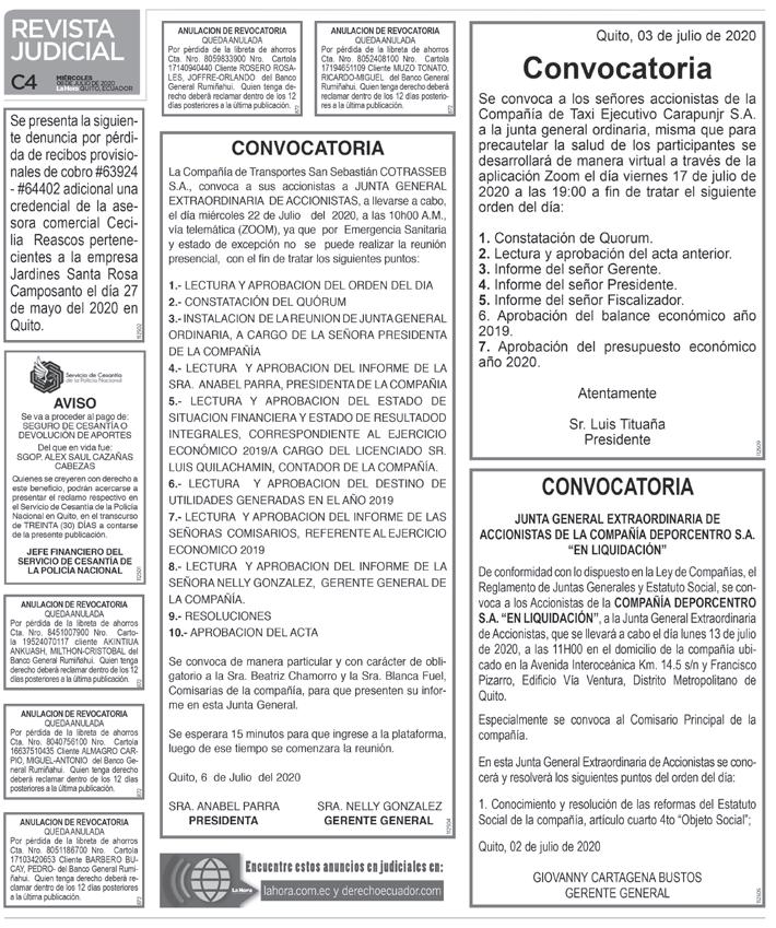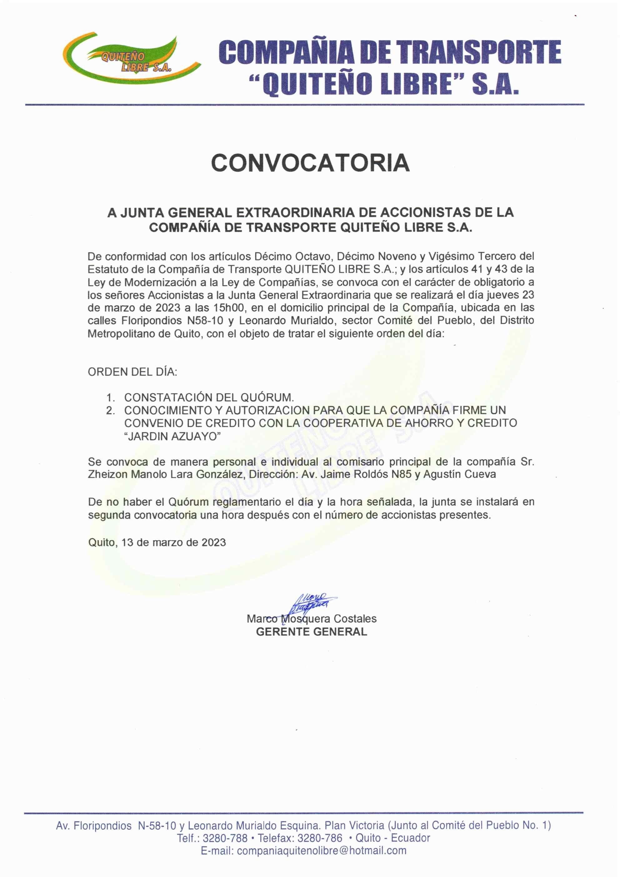 En observancia de lo previsto en el artículo 242 de la Ley de Compañías, se convoca de manera especial e individual al señor Hugo Erazo, Comisario Principal de la Compañía, domiciliado en el Distrito Metropolitano de Quito, Calderón Calle Carapungo Nro. 120 Los informes, estados financieros, anexos y demás documentación y sus anexos, estarán a disposición de los accionistas en la oficina de la compañía ubicada en Calderón Calle 9 de agosto y Paredes Pasaje N3A OE4230 del Distrito Metropolitano de Quito, para su conocimiento y revisión; así como estos documentos serán enviados a cada uno de los señores accionistas a sus direcciones de correo electrónico registrados en la Compañía, considerando lo establecido en Artículo 4 del Reglamento sobre Juntas Generales emitido por la Superintendencia de Compañías, Valores y Seguros mediante Resolución No. SCVS-INCDNCDN-2022-0010 de 21 de junio de 2022.