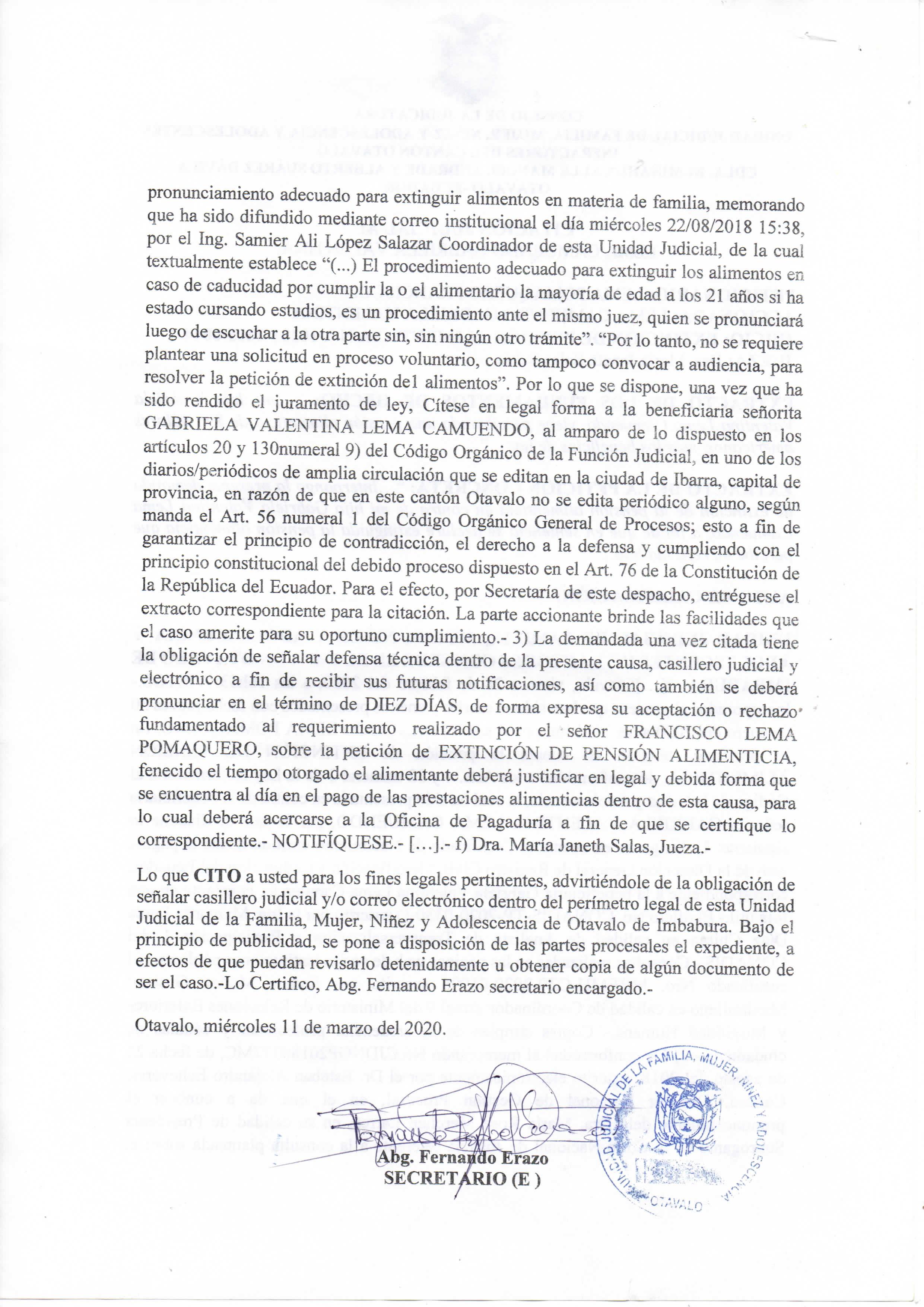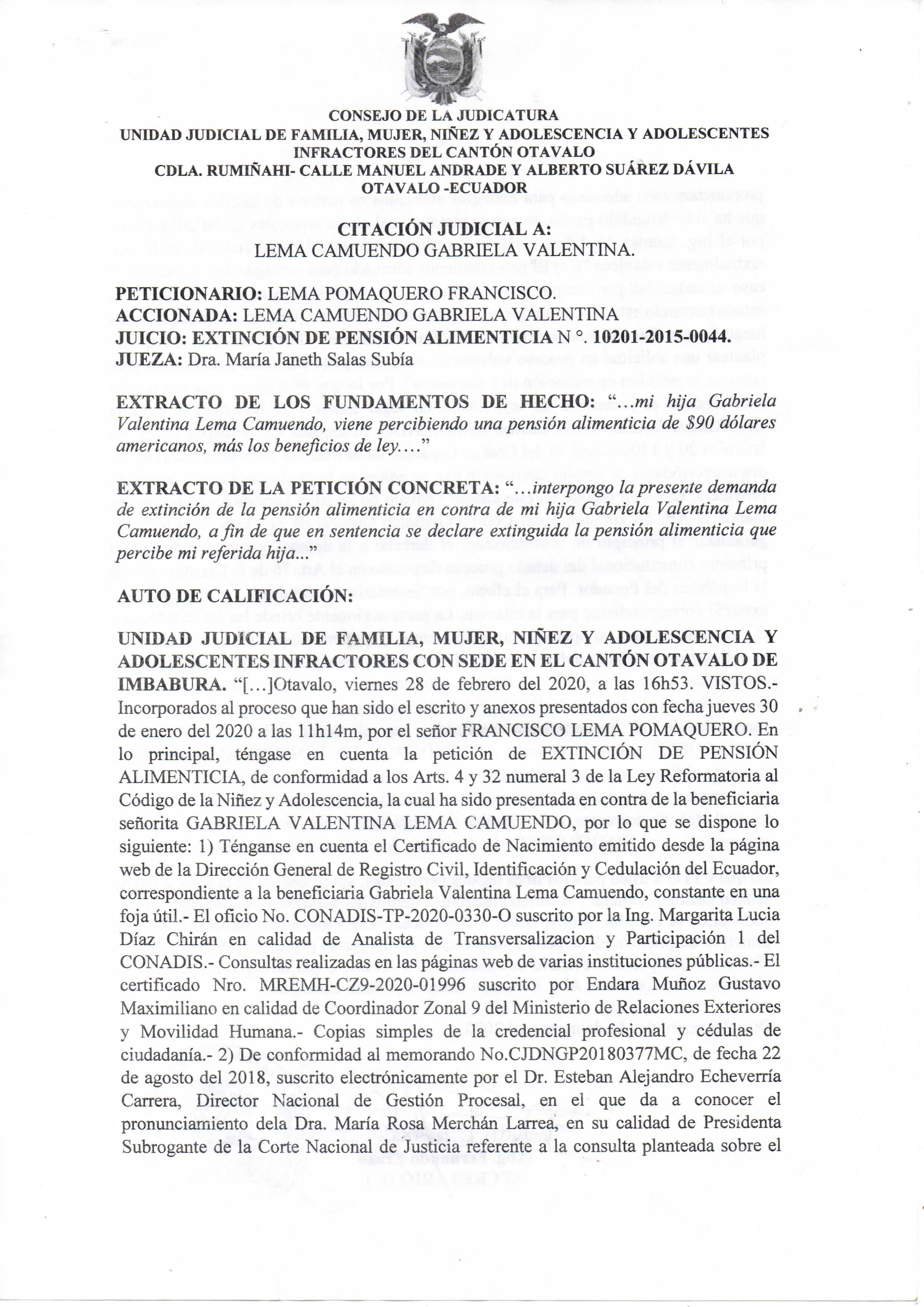 VISTOS: Agréguese al proceso el escrito presentado por el accionante y sus anexos, el mismo que se toma en consideración en el presente pronunciamiento.- En lo principal, habiéndose dado cumplimiento a la resolución expedida el 04 de octubre del 2016 y transcurrido el término previsto en el mismo, corresponde emitir la respectiva resolución de esta causa judicial que se inicia en virtud de la demanda propuesta por José Alberto Flores Sánchez en la que luego de consignar sus generales de Ley manifiesta que su madre María Maclovia Flores Sánchez padece de discapacidad auditiva y en tal virtud en incapacidad de celebrar actos y contratos; que su referida madre es mayor de edad, de estado civil soltera y que él es el único descendiente por tanto el consanguíneo más próximo; hace referencia que su madre es coheredera de los bienes inmuebles que los detalla en la demanda; conforme los artículos 747 y 749 del Código de Procedimiento Civil solicita se declare la discapacidad en sentencia y que ésta sea inscrita en los libros respectivos y que de ella se dé noticia al público por aviso. Admitida la causa a trámite, se ha designado dos profesionales del Centro de Salud Tipo “C” de esta ciudad de Tabacundo para que realicen el examen psicosomático de la señora María Maclovia Flores Sánchez; se ha dispuesto que emita su opinión de uno de los señores fiscales de los Cantones Cayambe y Pedro Moncayo y se ha efectuado la audiencia de parientes.- Encontrándose la causa en estado de emitir la presente Resolución, para hacerlo, se considera: PRIMERO: El suscrito Juez tiene potestad jurisdiccional y competencia para conocer y resolver esta causa en virtud de los artículos 167 de la Constitución de la República; y, 245 del Código Orgánico de la Función Judicial.- SEGUNDO: En la tramitación de esta causa se han observado y respetado las garantías básicas del debido proceso constantes en el artículo 76 de la Constitución de la República, por lo que al no existir omisión de solemnidad o de procedimiento que pueda influir en la decisión de la causa, se declara la validez de lo actuado.- TERCERO: La Constitución de la República en su artículo 76, numeral 1 establece que corresponde a toda autoridad administrativa o judicial garantizar el cumplimiento de las normas y los derechos de las partes”; consecuentemente es deber del juzgador garantizar los derechos de las partes y el estricto cumplimiento de las normas jurídicas vigentes aplicables al caso concreto, circunstancia que constituye además la efectiva vigencia de la seguridad jurídica prevista en el artículo 82 de la misma Carta Constitucional.CUARTO: De acuerdo a nuestro Código Civil, todas las personas son capaces excepto aquellos que la Ley los considera incapaces, siendo la persona sorda que no pueda darse a entender de manera verbal, por escrito o por lengua de señas una de aquella clase de incapaces, debiendo dotársele de curador de acuerdo a lo dispuesto en los artículos 490, 479, 480, 484 y 485 del Código Civil; en la presente causa, el accionante José Alberto Flores Sánchez manifiesta que su madre María Maclovia Flores Sánchez padece de esta incapacidad por lo que solicita se le nombre curador de aquella.- QUINTO: En la presente causa se ha dispuesto el reconocimiento psicosomático con la intervención de dos profesionales, del cual se desprende: a) Informe presentado por la Dra. María Ortega Vasquez, Médico Tratante del Centro de Salud Tipo C Tabacundo, quien en su parte pertinente expresa: “…Al examen físico la paciente llega caminando está lúcida tiene dificultad para pronunciar las palabras no se le entiende lo que dice. Obedece las órdenes que se le da con señas como es traer objetos, al indicar un esfero frente a ella le sigue con la vista al esfero para arriba, abajo, haca los lados derecho e izquierdo.. EXAMEN MENTAL: no se entiende lo que habla…”.- b) Informe Psicológico Inicial CTS 13-2015 presentado por la Dra. Kathy Sánchez R., Psicóloga Clínica de la casa de salud antes indicada, quien en la evaluación psicológica expresa: “…Se realiza entrevista inicialmente semiestrcturada y luego estructurada; a las cuales trata de entablar un conversatorio con la paciente siendo imposible entender lo que quiere manifestar o trasmitir. Como segundo recurso se le solicita que escribe su nombre ya que mediante información que proporciona su nuera se conoce que la paciente ha sido alfabetizada; sin embargo sus trazos son escuetos e infantiles, no tiene una secuencia ni una figura entrelázala. Por consiguiente se desconoce si existe ubicación autopsiquica y alopsiquica. Se presente risueña durante toda la entrevista. Además se puede observar que domina la marcha. Según referencias de la nuera realiza actividades sencillas, quehaceres domésticos y se dedica a la agricultura. Es nula en calculo y operaciones matemáticas. Aparentemente percibe sonidos externos pero no existe conexión en cuanto a su atención y su percepción del entorno. Se encuentra tranquila durante la entrevista, trata de conectarse con el conversatorio pero es imposible entablar un diálogo directo con la paciente…”.- Se ha solicita la opinión de uno de los señores fiscales, en tal virtud, el Dr. José Antonio Cevallos García, Fiscal de los cantones Cayambe y Pedro Moncayo expresa que “No existe oposición alguna de parte de la Fiscalía General del Estado, a fin de que declare la Interdicción a la señora María Maclovia Flores Sánchez”.- En la audiencia efectuada en esta causa, el suscrito Juzgador realiza preguntas básicas a la señora María Maclovia Flores como sus nombres, edad, personas con la que vive a las cuales no responde lo cual concuerda con lo expresado en los informes de examen psicosomático; en esa misma diligencia son escuchados su padre señor José Alberto Flores Tituaña y sus hermanos Segundo Rafael, María Esperanza, Luis Aníbal y Martha Cecilia Flore