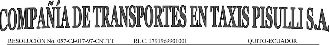De acuerdo con la Ley de Compañías y el Estatuto Social, se convoca a Junta General Ordinaria de Accionistas de la COMPAÑÍA DE TRANSPORTE EN TAXIS PISULLI S.A., a celebrarse el día jueves 18 de abril del 2024 a las 10H00 am en la Da Vince OE4-93 y Av. de la Prensa Edificio Dolorosa para tratar; el siguiente Orden del Día: