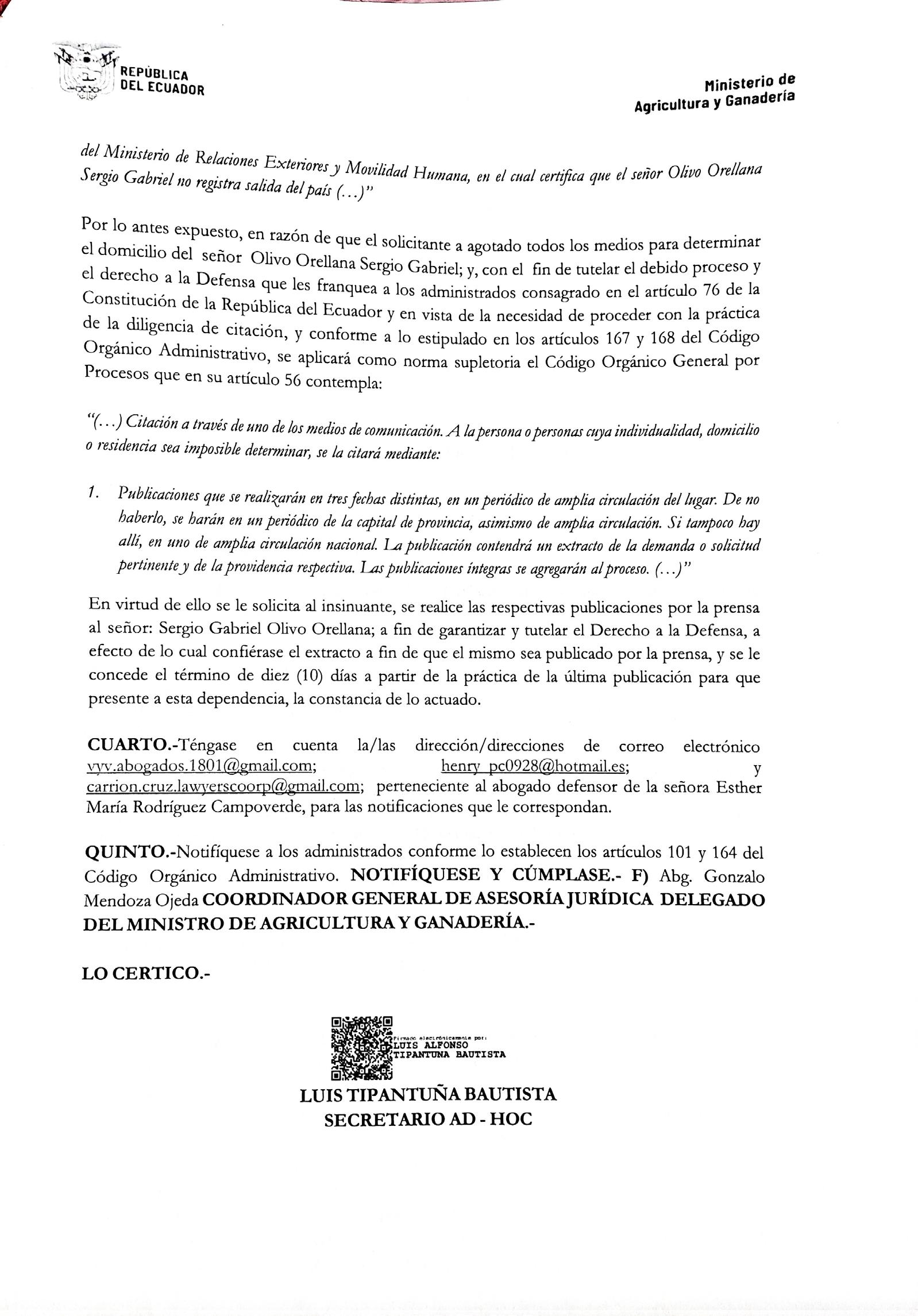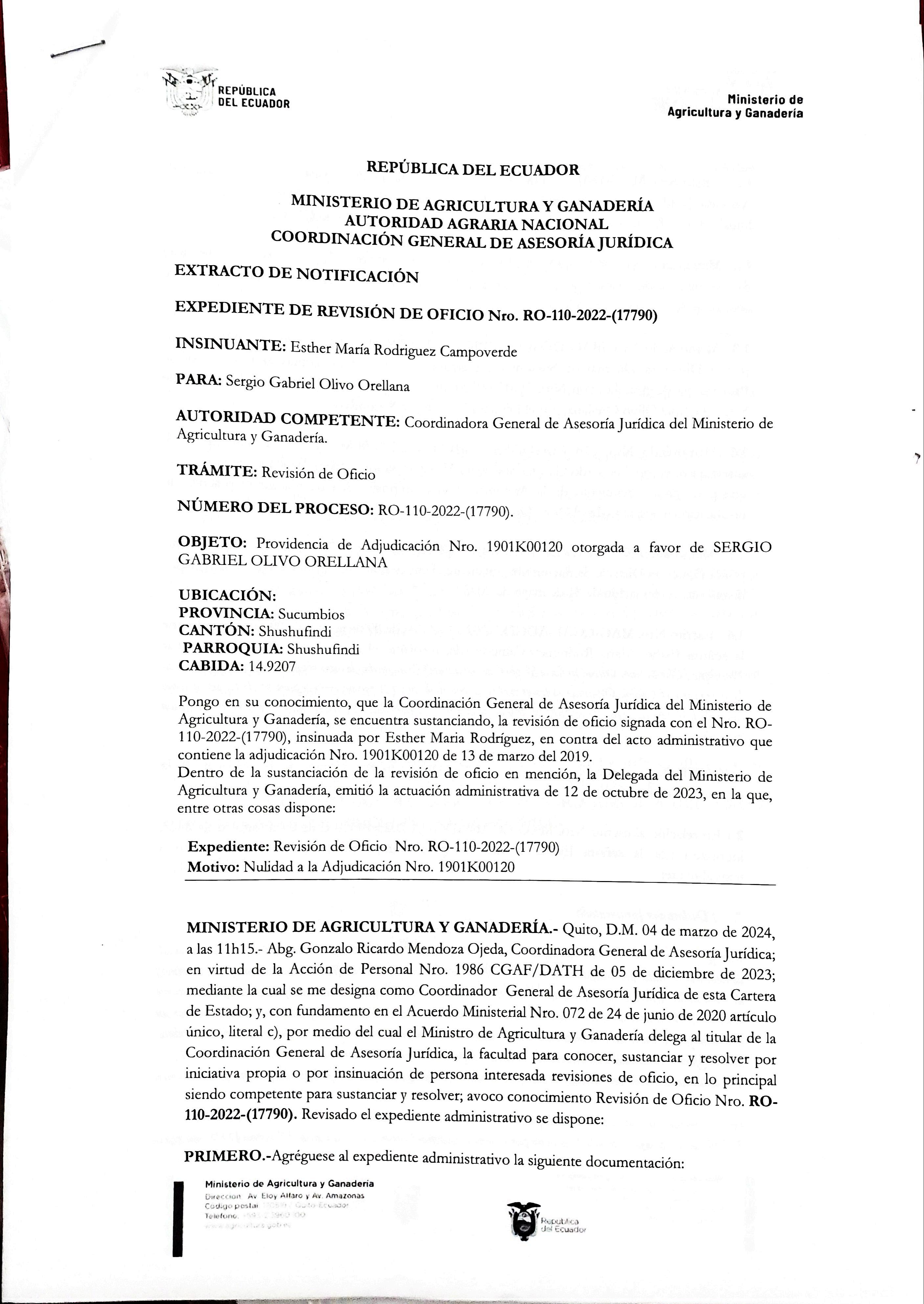 Pongo en conocimiento, que la Coordinación General de Asesoría Jurídica del Ministerio de Agricultura y Ganadería, se encuentra sustanciando, la revisión de oficio signada con el Nº RO-110-2022-(17790), insinuada por Esther Dentro de la sustanciación de la revisión de oficio en mención, la Delegada del Ministerio de Agricultura y Ganadería, emitió la actuación administrativa de 12 de octubre de 2023, en la que, entre otras cosas dispone: