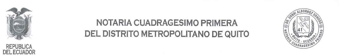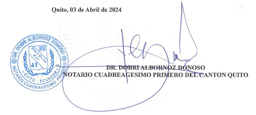 NOTARIA CUADRAGESIMO PRIMERA DEL CANTON QUITO: Pongo en conocimiento del público que, mediante escritura pública, otorgada ante el Dr. Dobri Albornoz Donoso, Notario Cuadragésimo Primero del Cantón Quito, el 03 de Abril de 2024, la señora ANGELA MARIA JARA OLMEDO y el señor WASHINGTON VINICIO HERRERA MONTALUISA, procedieron a liquidar la sociedad conyugal. - Las adjudicaciones del patrimonio se encuentran detalladas en el texto de la referida escritura pública de liquidación de la sociedad conyugal; por lo que en aplicación a lo dispuesto en el Articulo 18 numeral 23 de la Ley Notarial, faculta al Notario disponer la inscripción en los Registros de la Propiedad y Mercantiles, de la escritura pública de liquidación de sociedad conyugal; previo el trámite previsto en dicha norma legal, se pone en conocimiento del público, mediante una publicación, el extracto de la liquidación del patrimonio de la sociedad conyugal correspondiente a los cónyuges señora ANGELA MARIA JARA OLMEDO y el señor WASHINGTON VINICIO