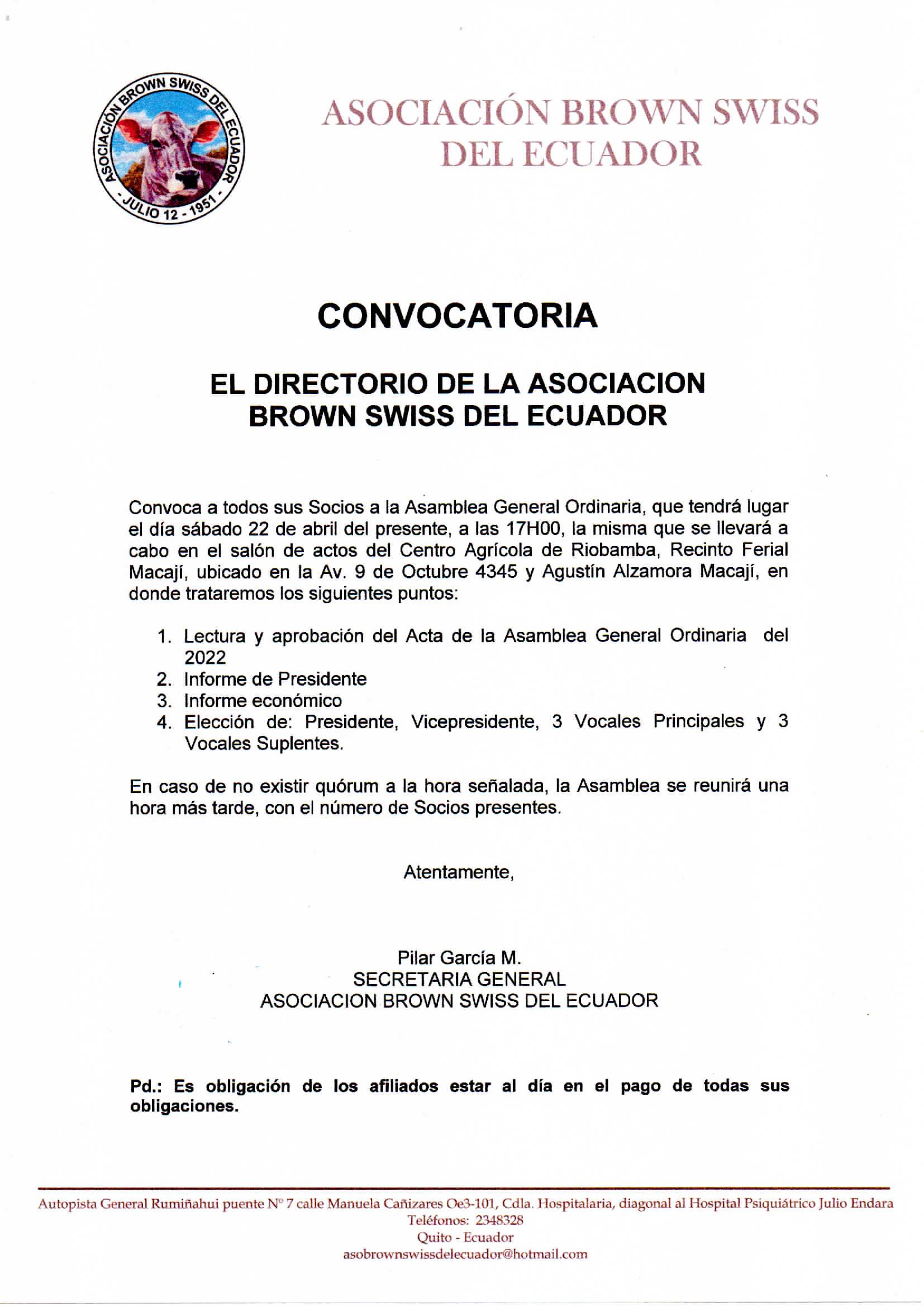 Dando cumplimiento a lo establecido en los Estatutos de la compañía y en la Ley de Compañías, se convoca a los señores socios a la Junta General Ordinaria de Socios que tendrá lugar en el domicilio social, en la Av. 12 de Octubre N24-562 y Luis Cordero, el día 20 de abril de 2023, a las 14:00 horas, para conocer y aprobar el informe de Gerente, informe de Comisario y estados fnancieros correspondientes al ejercicios económico al 31 de diciembre de 2022, aplicación del resultado económico y asuntos varios.
