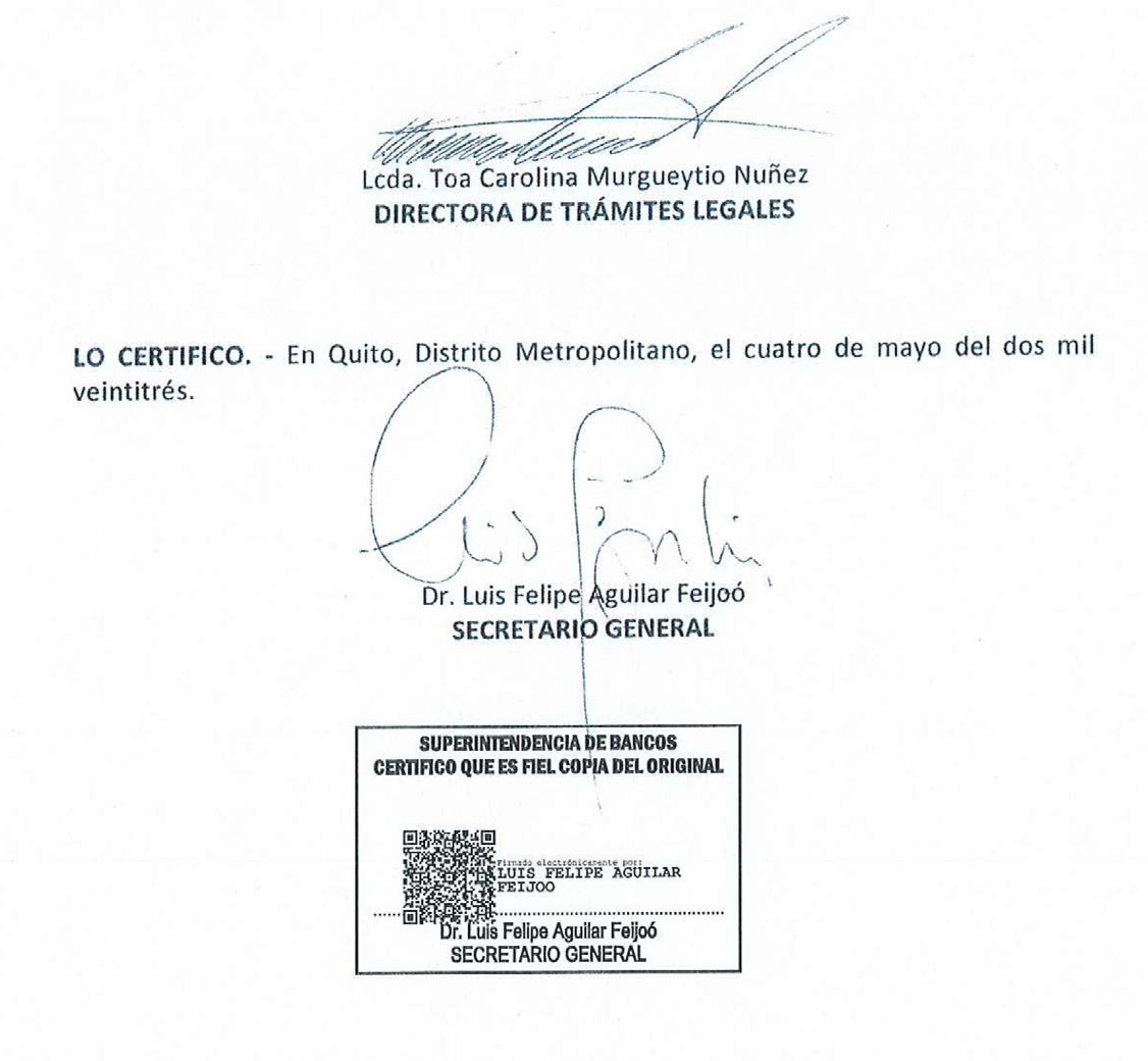 COMUNÍQUESE. - Dada en la Superintendencia de Bancos, en Quito, Distrito Metropolitano, el cuatro de mayo del dos mil veintitrés.