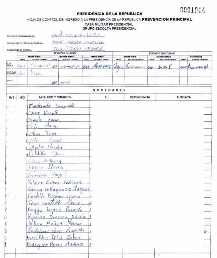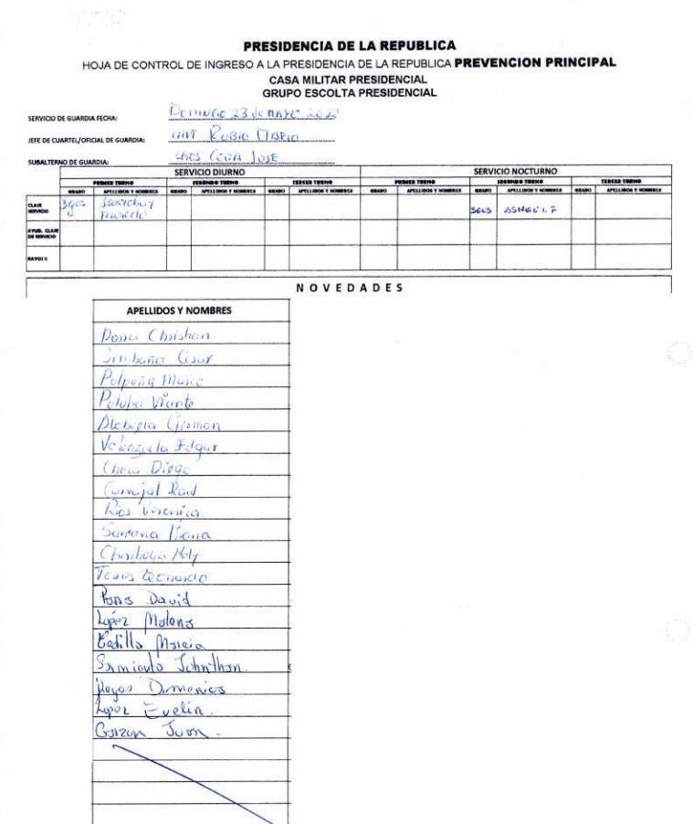 La documentación entregada por la Casa Militar está en dos archivos digitales con más de 1.300 páginas escaneadas; con su respaldo físico en dos carpetas Bene. En estas se puede observar la imagen de cada hoja del registro de visitas por la prevención principal de Carondelet, como también el registro de extranjeros, desde el 24 de mayo de 2021 hasta la fecha de solicitud.