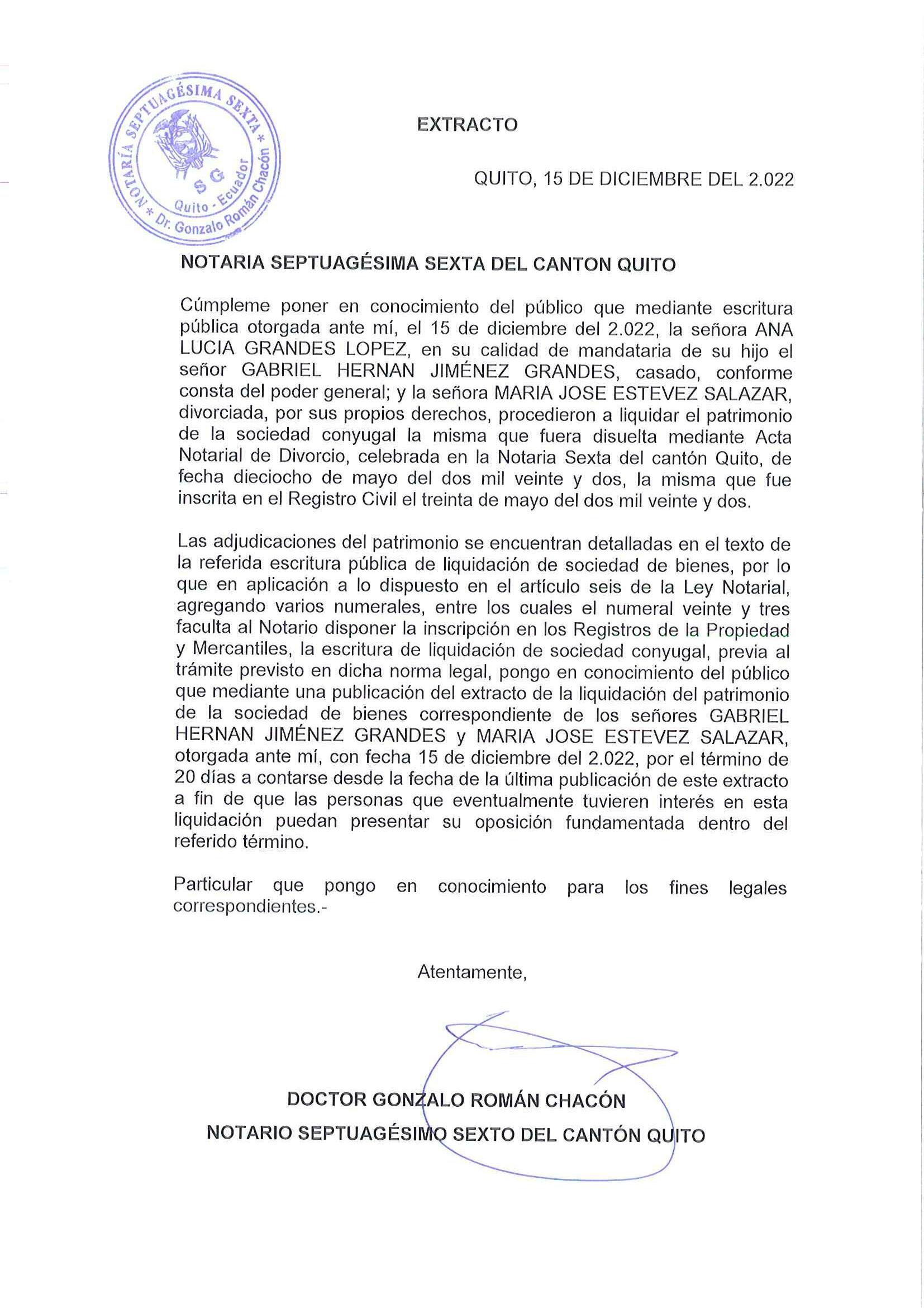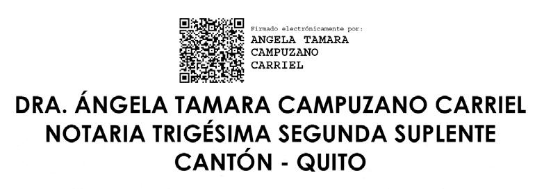 Pongo en conocimiento del público que mediante Escritura Pública, otorgada ante mí Doctora Ángela Tamara Campuzano Carriel, Notaria Trigésima Segunda Suplente del Cantón Quito, el 16 de diciembre del 2022, los señores Efraín Armando Campaña Vega; y, Mercedes Avila Lascano, procedieron a Liquidar la Sociedad conyugal, la cual fue disuelta, en virtud de la disolución del vínculo matrimonial que fue efectuado, mediante Acta Notarial de Divorcio de fecha 16 de noviembre del 2021, ante el Notario Tercero del Cantón Rumiñahui, y con fecha 19 de noviembre del mismo año se inscribió, tomando razón al margen del Acta de Matrimonio. Las adjudicaciones del patrimonio se encuentran detalladas en el texto de la referida escritura pública de liquidación de sociedad conyugal, por lo que en aplicación a lo dispuesto en el Art. 18 numeral 23, artículo reformado por Disposición Reformatoria Décimo Quinta de Ley No. 0, publicada en Registro Oficial Suplemento 506 de 22 de Mayo del 2015 , faculta al Notario disponer la inscripción en los Registros de la Propiedad y Mercantiles, la escritura de liquidación de sociedad conyugal, previo el trámite previsto en dicha norma legal, pongo en conocimiento del público, mediante una publicación, el extracto de la liquidación del patrimonio de la sociedad conyugal correspondiente a los señores Efraín Armando Campaña Vega; y, Mercedes Avila Lascano, otorgada mediante escritura pública de 16 de diciembre del 2022 ante esta notaría, por el término de veinte (20) días a contarse desde la fecha de la última publicación de este extracto, a fin de que las personas que eventualmente tuvieren interés en esta liquidación puedan presentar su oposición fundamentada, dentro del referido término.
