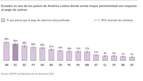 Ecuador es el segundo país en América Latina con más alto índice de tolerancia a las coimas, solo superado por Jamaica. Por el contrario, del otro lado de la balanza, los países de América Latina que menos consienten el pago de soborno son El Salvador y Brasil, con 93%, mientras Uruguay ocupa el tercer lugar.