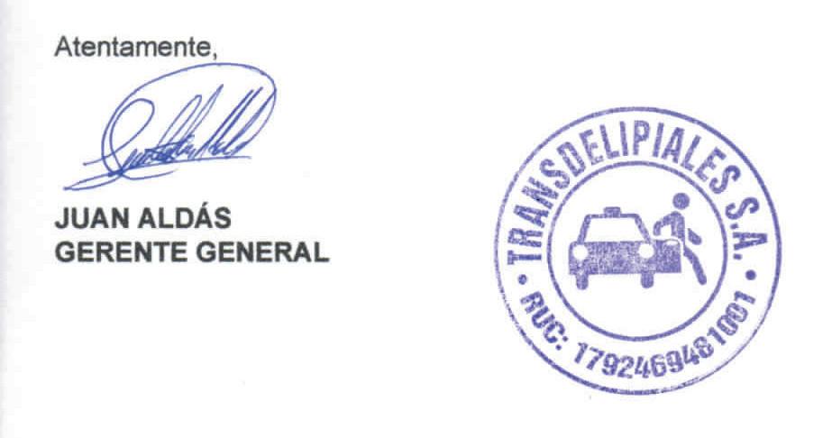 Se convoca a los señores accionistas de la Compañía de Transporte en Taxi Ejecutivo Transdelipiales S.A., y, especialmente al señor comisario Dr. Wilmer Rosales, a la Junta General Ordinaria de Accionistas, la misma que se llevará a efecto el día lunes 25 de marzo de 2024, a las 17h00 en las instalaciones de la Sede de la Liga Barrial “La Isla”, ubicada en el sector del Tejar en la calle Baños entre la prolongación Mejía y Ontaneda; a fin de tratar el siguiente orden del día: