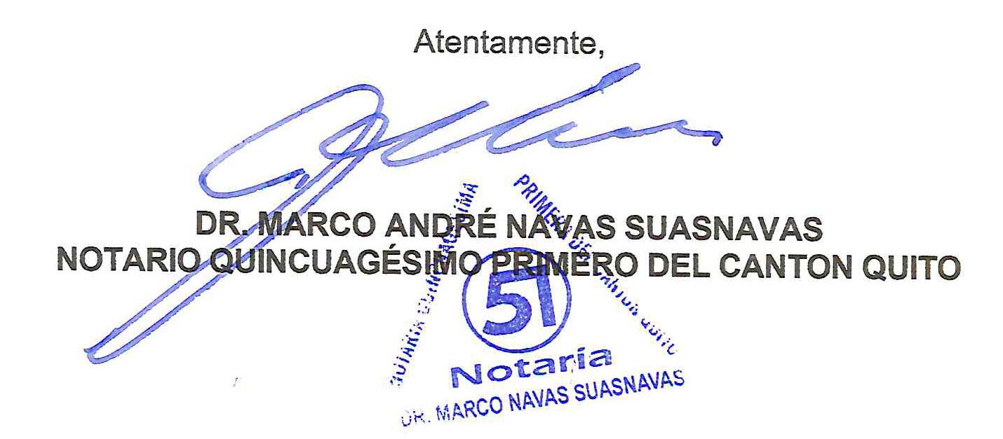 NOTARIA QUINCUAGÉSIMA PRIMERA DEL CANTON QUITO: MEDIANTE ESCRITURA DE CONSTITUCION DE LA SOCIEDAD CIVIL Y COMERCIAL; denominada AQUA S.C.C., CELEBRADA EN ESTA NOTARIA, EL DIEZ DE ENERO DE DOS MIL VEINTE Y TRES. PROCEDEN A LA CONSTITUCION DE LA SOCIEDAD CIVIL Y COMERCIAL, CUYOS ESTATUTOS SE ENCUENTRAN DETALLADOS EN LA ESCRITURA REFERIDA ANTERIORMENTE, POR LO QUE EN APLICACIÓN A LO DISPUESTO, EL ARTICULO DIECIOCHO DE LA LEY NOTARIAL AGREGANDO VARIOS NUMERALES, Y AL NO HABER OPOSICION ALGUNA DENTRO DEL REFERIDO TÉRMINO, ENTRE LOS CUALES EL NUMERAL VEINTITRES FACULTA AL NOTARIO DISPONER LA INSCRIPCIÓN EN EL REGISTRO MERCANTIL; Y, POR LO TANTO DISPONGO LA INSCRIPCION DE LA ESCRITURA DE CONSTITUCION DE LA SOCIEDAD CIVIL Y COMERCIAL; denominada AQUA S.C.C., ANTES MENCIONADA EN EL REGISTRO MERCANTIL DEL ECUADOR CORRESPONDIENTE.