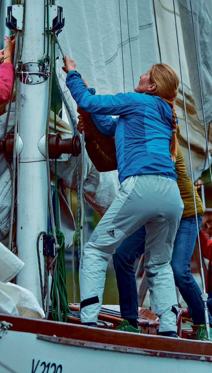 „DerJunge,aufdenmanbesondersachtenmusste,weilernichtaneinerSache dranbleibenkonnteunddannauch schnellweglief,bliebbeimAbtakelndie ganzeZeitnebendemBootstehen,sah dabeizu,wiedieSegelaufgerolltwerden undwolltegenauwissen,wie’sgeht.“ Gielenistsicher:„Segelnentschleunigt undmankanndabeiganzbei demMenschensein,denmanbegleitet“,under betont:„UnserAngebotläuftganz bewusstnichtunterdemSchlagwort‚therapeutischesSegeln ,aberessinddoch aufalleFälleimmerwiedersolcheEffektesichtbar.“