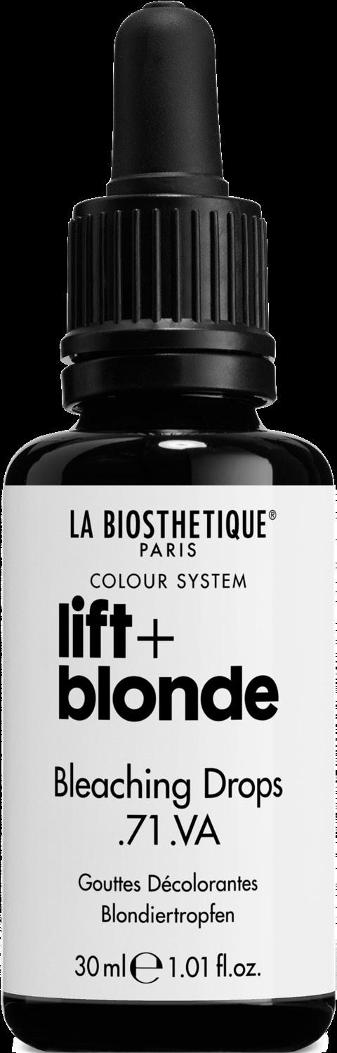 Bleaching Drops .71 .VA ensure a flawless, neutral blonde and can also achieve cool, iridescent results if desired. Thanks to the bleach-resistant colour pigments they contain, they enable precise neutralisation during the bleaching process in combination with the bleaching products in the Lift + Blond range. This creates an ideal basis for further applications.