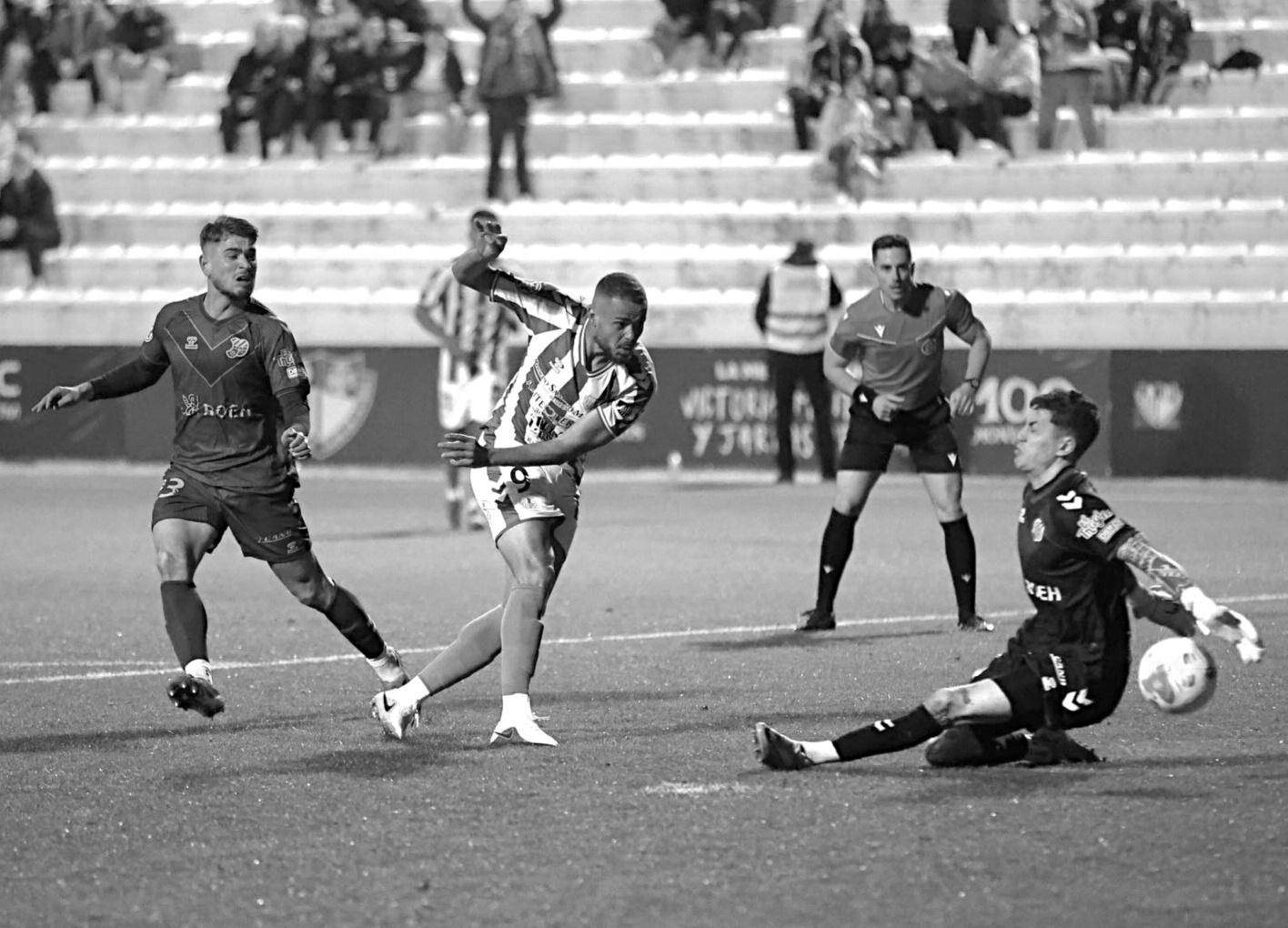 En el 33′ fue Destiny quien tuvo una buena oportunidad de hacer gol en una acción en la que es experto el malagueño, de origen nigerino, en velocidad aprovechando un pase a la espalda de la defensa de Adriá Gené El disparo final del delantero no fue ejecutado de la mejor forma y el balón acabó fácil en las manos de Juan Flere