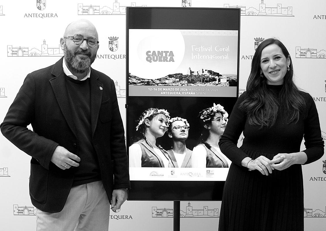 ANTEQUERA Del 12 al 15 de marzo, Antequera se convertirá e n s e d e i n t e r n a c i o n a l d e l a música coral con la celebración de ‘Cantaquera – Festival Coral Internacional’, una cita organizada junto a la entidad alemana Interkultur que reunirá en la ciudad a trece coros procedentes de diez países, además de la representación española La present a c i ó n c o r r i ó a c a r g o d e l a teniente de alcalde de Turismo, Ana Cebrián, y del concejal de Cultura, José Medina Galeote, quienes pusieron de relieve tanto la dimensión cultural como el impacto turístico del evento