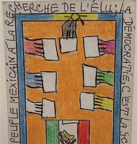 nantes ni de los poderosos, y que está apuntalada en el sufragio. Cada postal está circunscrita por la misma frase, en francés. La ilustración dedicada a México muestra siete manos, de diferentes colores, con papeletas que están a punto de introducir en la urna con la bandera tricolor. En torno a ellas, se lee: “El pueblo mexicano en busca del elegido”. Bouabré se refiere al gobernante cuya legitimidad descansa en las urnas. No piensa en caudillos, sino en demócratas. Por eso añade: “La democracia es la ciencia de la igualdad”.