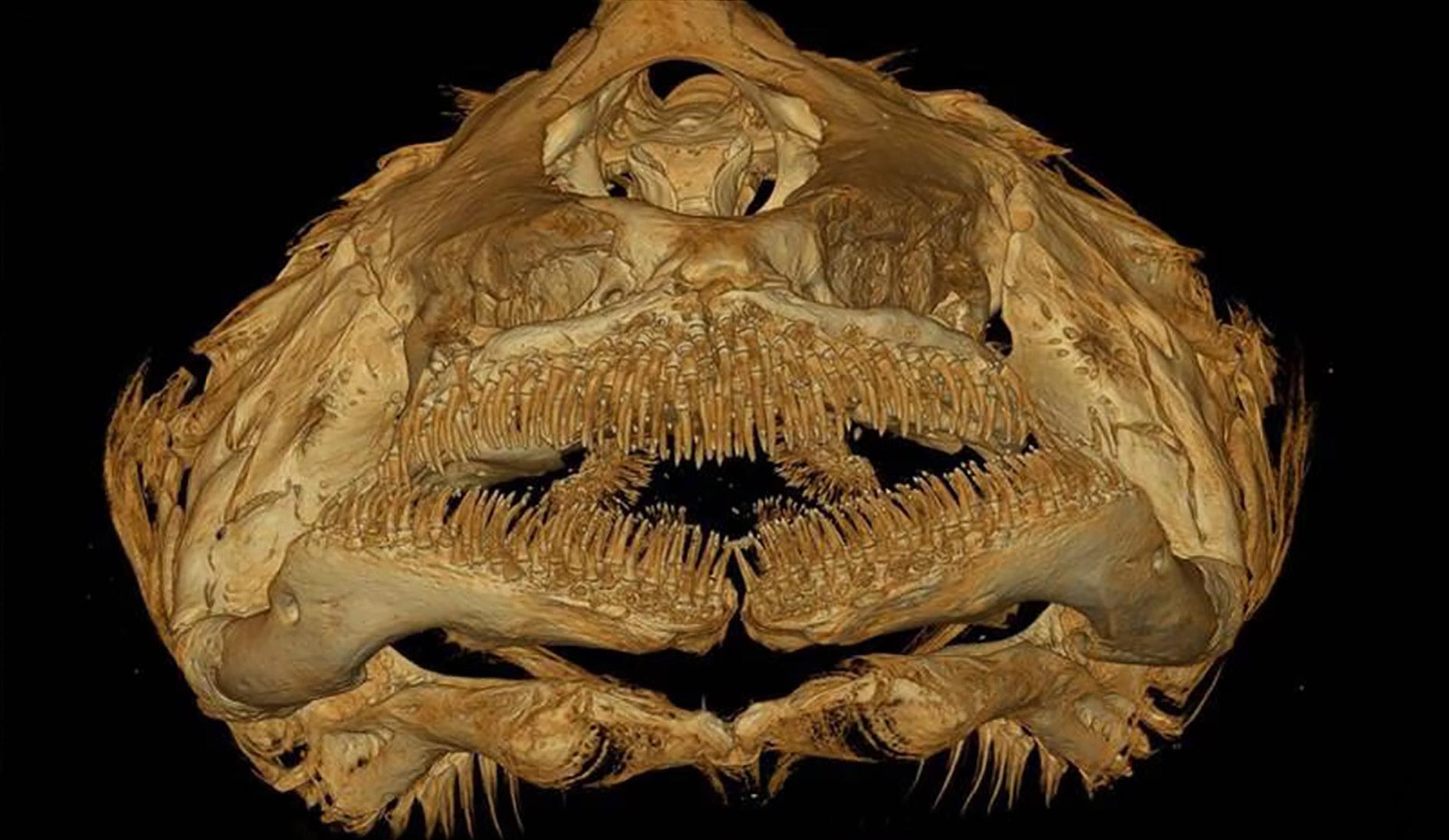 Imagen de tomografía computarizada del cráneo de Horaglanis populi en vista frontal.
