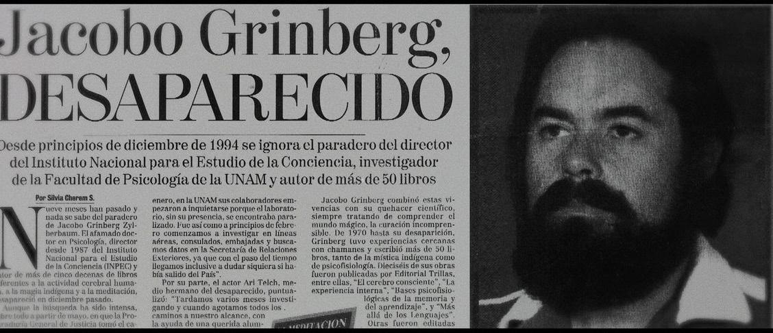 Twitter:@citlallifEn marzo de 1995 comenzaron las labo res de búsqueda para localizar al psicó logo y neurofisiólogo Jacobo Grinberg, desaparecido desde el 8 de diciembre de 1994. A 27 años del suceso las dudas so bre lo que realmente pasó con Grinberg continúan latentes ¿murió a manos de su esposa? ¿el gobierno de Estados Unidos lo capturó porque sabía demasiado? ¿o era un ser tan iluminado que logró tras cender de hacia otra realidad?