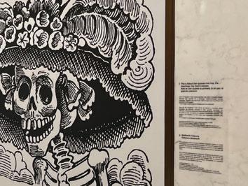 En varias vitrinas y carteles expuestos en el lobby de uno de los edificios del complejo se pueden ver ilustraciones icónicas como “El Panteón de las pelonas”, en el que aparece la calavera “Garbancera” con un sombrero adornado al estilo europeo para ocultar sus orígenes, y que más adelante se convertiría en la famosa calavera Catrina.