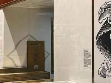En el lobby de unos de los edificios del complejo montan la exposición; entre las obras que se exhiben figuran ilustraciones icónicas como “Garbancera”