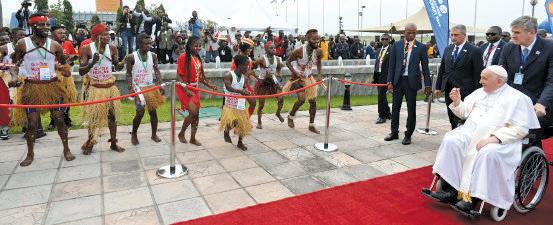 Jóvenes reciben con cánticos y danzas a un sonriente Francisco a su llegada al aeropuerto de Kinshasa,