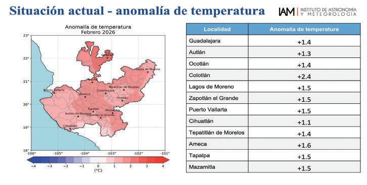 Especialistas del Instituto de Astronomía y Meteorología de la UdeG anticipan temperaturas entre 0.5 y 1.5 grados por encima de lo normal en varias regiones del estado, además de cielos despejados y mayor radiación UV.