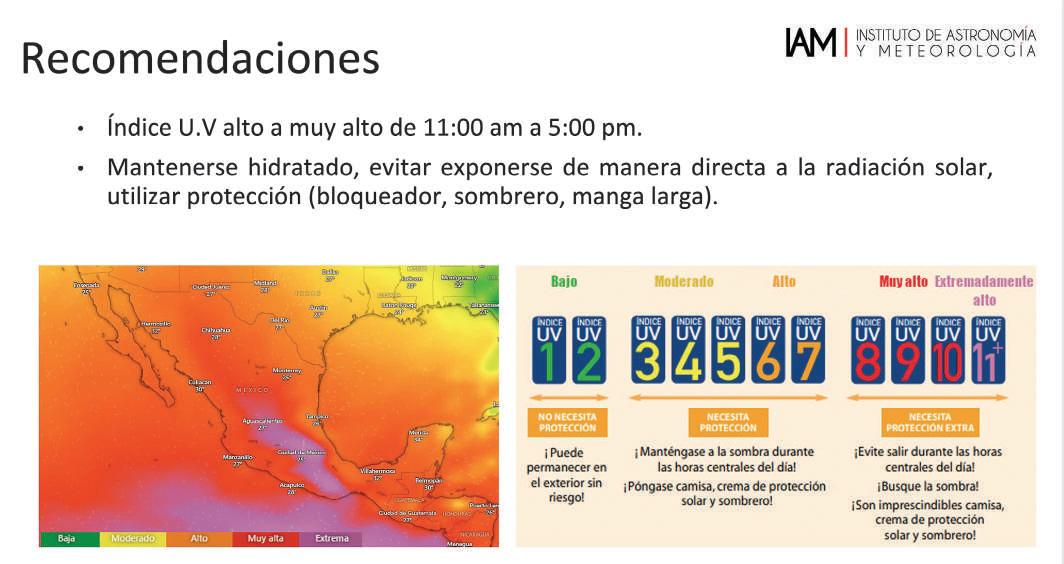 Con la llegada de la primavera astronómica, se espera un ambiente cálido y cielos despejados, lo que incrementará los índices de radiación UV. Por ello, Zamora Salvador recomendó el uso de bloqueador solar, ropa protectora y evitar la exposición directa al sol entre las 12:00 y las 16:00 horas.