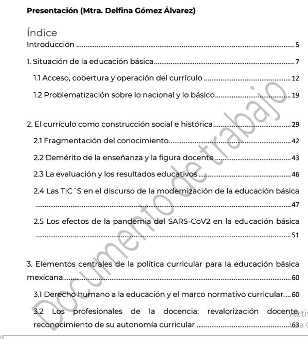 primero cuanta con cinco bloques principales: Situación de la educación básica, El currículo como construcción social e histórica, Elementos centrales de la política curricular para la educación básica mexicana, Estructura curricular del Plan de estudios 2022 y Evaluación de los aprendizajes. Un sexto se denomina “Pautas para la puesta en marcha”, pero se alerta: “está en construcción”.
