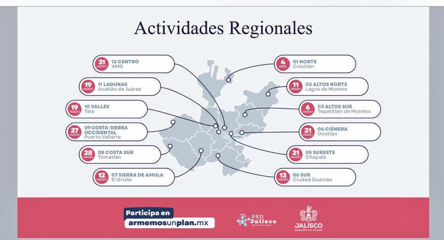 integral y sostenible del estado de Jalisco, definir y marcar el rumbo de cada región debe ser un asunto de corresponsabilidad entre ciudadanía y gobierno, también con el acompañamiento de la sociedad civil, sector productivo y academia. El propósito es claro: construiremos un plan que refleje la visión y aspiraciones de quienes habitan y trabajan en estos municipios. Porque solo a través de la participación y el compromiso colectivo, podemos garantizar un Jalisco más próspero, equitativo y seguro para todas y todos.