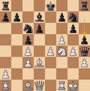 22.Tf2 Txf2 23.Rxf2 Cg7 24.b4 h5 25.h3 hxg4 26.hxg4 f5 27.g5 Rf7 28.b5 Ce7 29.Axd4 Cxd5 30.cxd5 también conduce a la igualdad] 11...Ad7?! [11...De7!) 12.h3? [12.Tb1 obliga a la pérdida de 16.Cg2!! Dxh3 [16...Dd8 17.fxg6 fxg6 18.e5] 17.Tf3 Dxg4 18.Ae2 gxf5 19.Te3 Dg5 20.exf5+ Ce7 21.Dxd6 Ac6 22.Te4! Dxg2+ 23.Rxg2 Axe4+ 24.Rf2 Axf5 25.Ag5 1–0