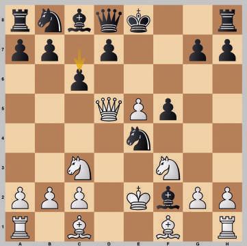 11….d4 (Pierde la pequeña ventaja que tenía. Hay que jugar 11….Dc7 12. Cb5 Da5 13.Ad3 d6 pero es muy difícil descubrirlo en el tablero) 12.Af4 Db6? Un desacierto del cual no hay retorno. Será interesante ver cómo las blancas activan sus torres para llegar al rey negro)
