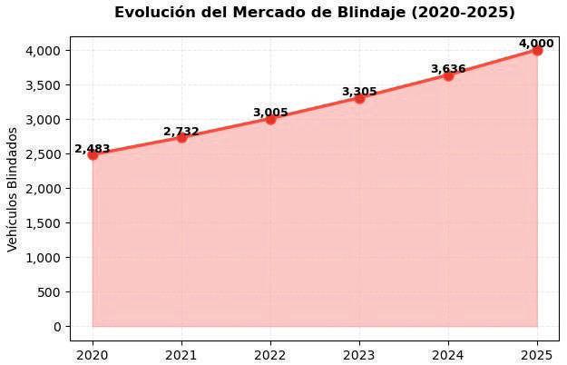 año pasado un estimado de 4,000 unidades fueron sometidas a refuerzos en su carrocería y cristales, lo que representa un 0.103% del parque vehicular, es decir, que un vehículo fue sometido al blindaje por cada 9,712 unidades.