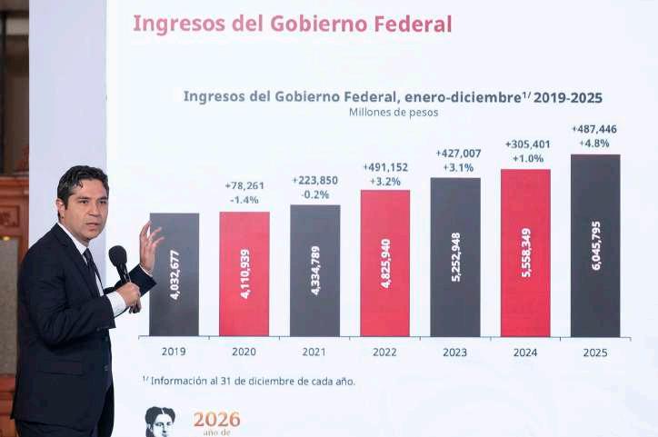 Administración. El Gobierno de México anunció que al cierre de 2025 el país alcanzó una cifra histórica en recaudación tributaria con más de 6 billones de pesos captados, lo que representa un récord absoluto en ingresos fiscales sin necesidad de subir los impuestos existentes. De esta forma el país no solo superó lo registrado en 2024, también excedió lo programado en la Ley de Ingresos de la