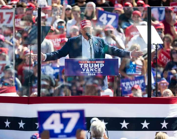 El expresidente estadounidense y candidato republicano a la presidencia, Donald Trump, aparece cada vez más protegido; así encabezó un mitin de campaña en el Aeropuerto Internacional de Wilmington, en Carolina del Norte.