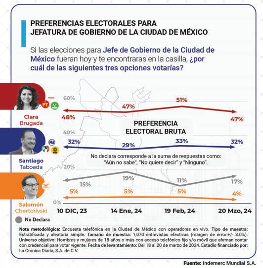 Elecciones CDMX . La encuesta Indemerc para Crónica de marzo arroja una ventaja bruta considerable de Clara Brugada sobre Santiago Taboada, aunque disminuida de 18 a 15 puntos en la preferencia bruta entre febrero y marzo, al tiempo que la cantidad de quienes no declaran preferencia (aún no saben, no quiere decir o ninguna) regresa a un muy alto 17 por ciento.