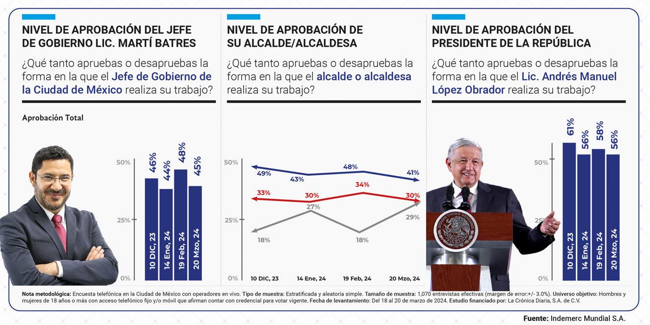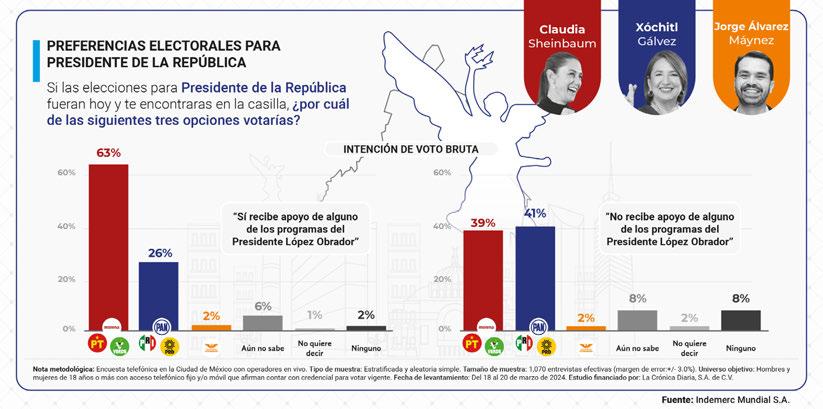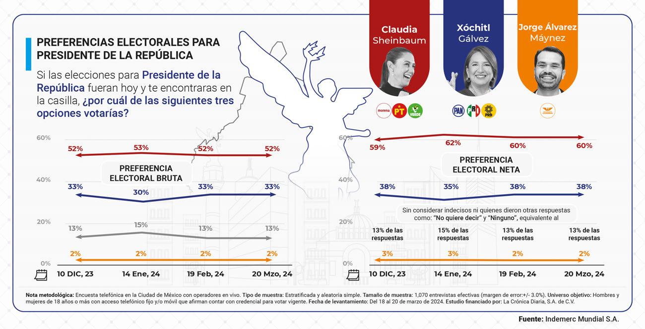 La encuesta Indemerc de marzo para Crónica arroja una ventaja de 15 puntos de preferencia bruta para la candidata morenista sobre Santiago Taboada, pero la cantidad de quienes no declaran preferencia (aún no saben, no quiere decir o ninguna) regresa a un muy alto 17%