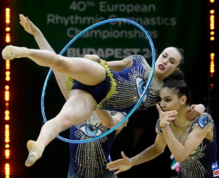 El equipo de Israel realiza su ejercicio de cinco aros en la final de la competición de grupos del 40 Campeonato de Europa de gimnasia rítmica en Budapest, Hungría.