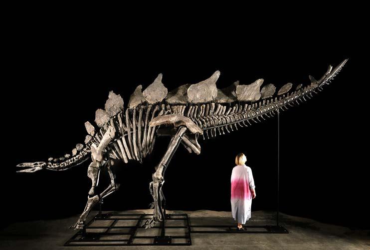 Fotografía cedida por Sotheby’s muestra a una persona parada junto a un Stegosaurus, un dinosaurio herbívoro de finales del período Jurásico con el lomo arqueado y la columna coronada por unas espinas que van desde la cabeza hasta la cola. El esqueleto más completo y mejor conservado de un dinosaurio Stegosaurus que vivió hace 150 millones de años se subastará en la casa Sotheby’s de Nueva York el próximo 17 de julio con un precio de salida entre 4 y 6 millones de dólares.