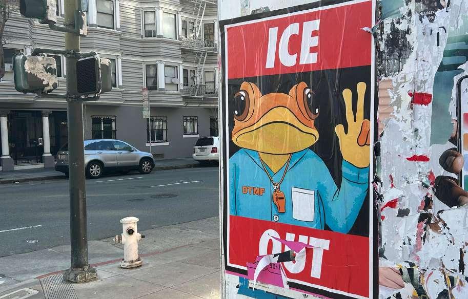 Imagen de un cartel con la imagen del sapo concho con la frase ‘ICE Out’ en una calle en San Francisco, California. El anfibio endémico de Puerto Rico en peligro de extinción y Bad Bunny son utilizados como símbolo autóctono de su reciente gira y ahora aparece en las calles de EU como cartel de protesta anti-ICE, días antes del Super Bowl.
