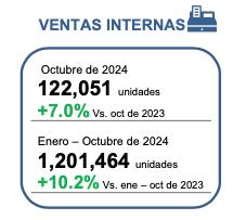 te factor representó el 20.1% de las ventas del mercado interno, mientras que la comercialización únicamente de marcas chinas fue equivalente al 9.2 por ciento. La colocación de automotores híbridos y eléctricos en octubre y su acumulado 2024 tuvieron avances de 65.8 y 74.7% con 11 mil 30 y 96 mil 796, respectivamente. Por último, el directivo auguró que para cierre de 2024, se espera la comercialización de 1,501,401 unidades, esto implicaría un avance anual de 10.1% con respecto al año anterior.
