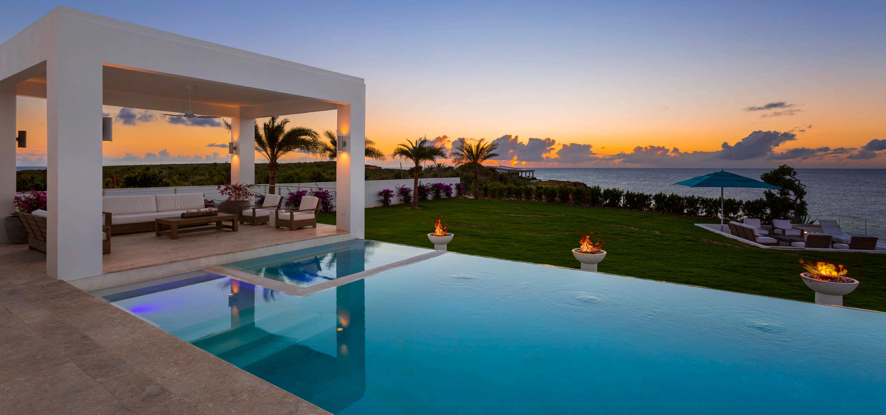 Contemporary architecture frames stunning views of mountains and sea. This exquisite villa shows off its oceanfront setting in thoughtfully designed indoor and outdoor living areas. Book the five-bedroom property separately for an island getaway, or with its sister villa to host a family reunion or intimate Anguilla destination wedding. The villa opens to a beautiful stone terrace with a private pool, hot tub and row of loungers looking out to the ocean and the neighboring island of St. Martin.