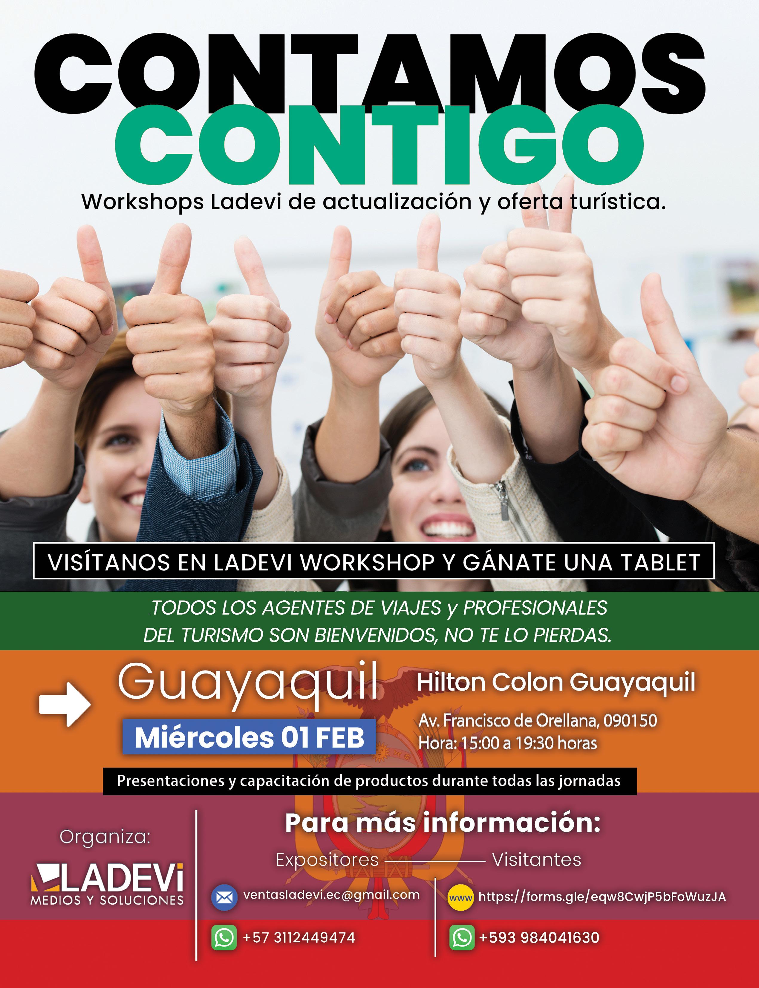 Ladevi Medios y Soluciones también realizó sus tradicionales Workshops en Quito y Guayaquil en mayo y noviembre, respectivamente. A cada uno de estos eventos asistieron más de 300 agentes de viajes, quienes conocieron de primera mano las ofertas de temporada y se capacitaron sobre productos de marcas como Xcaret, BM Tours y Visit Florida.