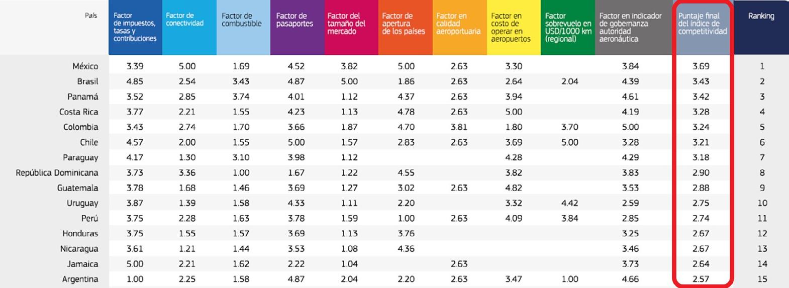 cado; Conectividad; Combustible y SAF; Medidas de apertura tras el Covid; Accesibilidad a mercados a través de Visados; Calidad aeroportuaria; Costos aeroportuarios; Costos de servicio de sobrevuelo; y Gobernanza de la autoridad aeronáutica de Aviación Civil.