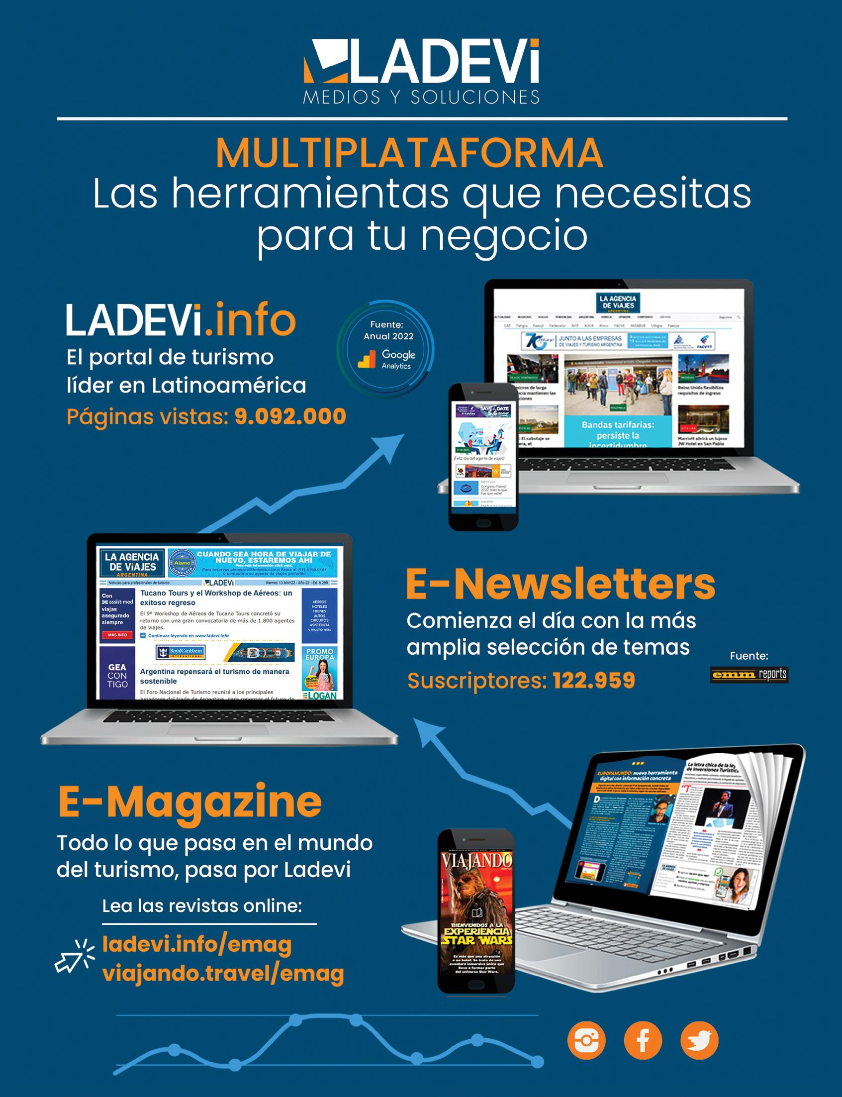 La Agencia de Viajes, es una publicación mensual de noticias de interés profesional para quienes operan en turismo. Las notas y servicios publicados son informaciones no relacionadas, directa ni indirectamente, con los mensajes publicitarios, que tienen su espacio y ubicación bien determinados. El editor no se responsabiliza por errores u omisiones de información, como así tampoco de sus consecuencias.