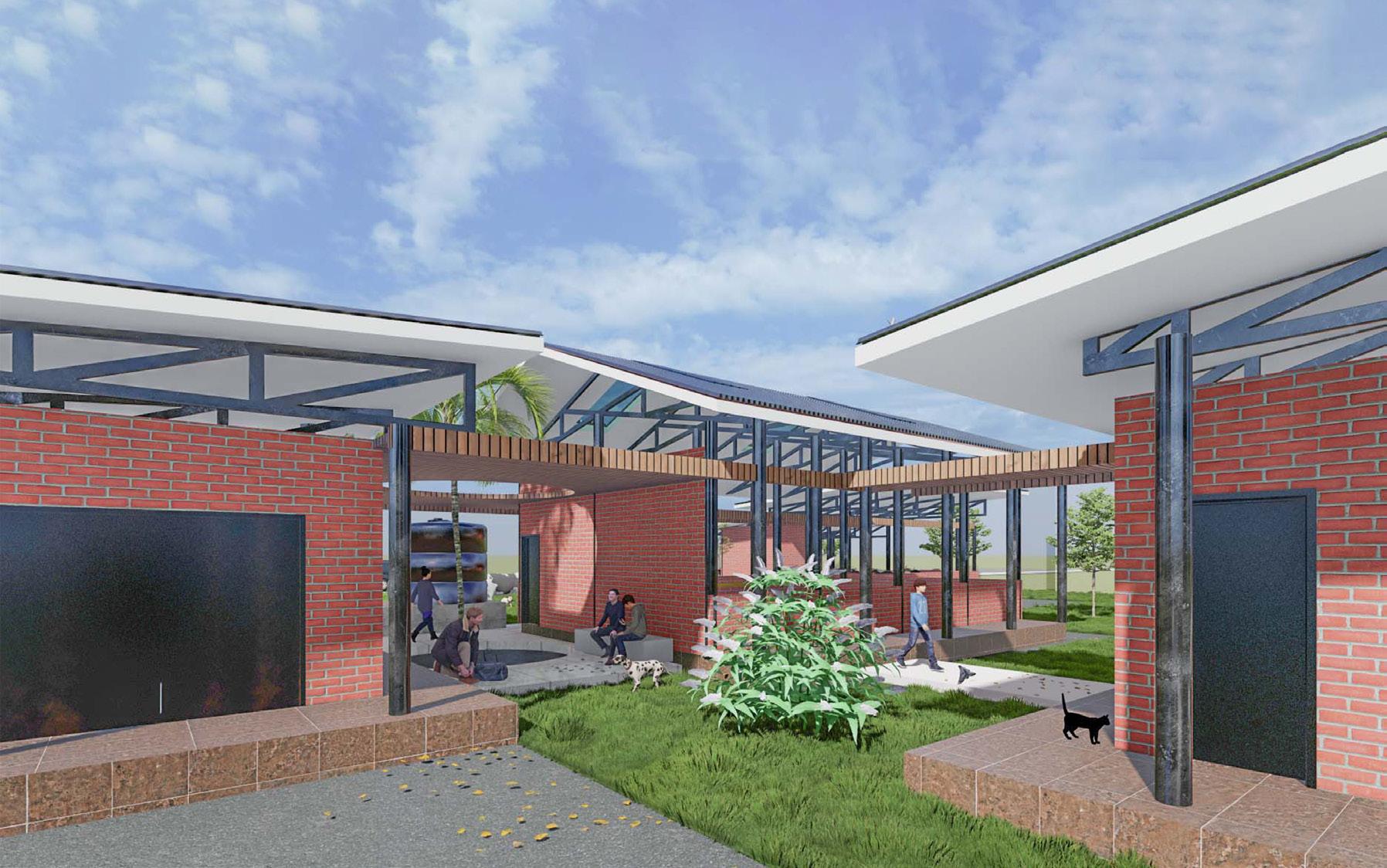 The facade showcases the unique texture and warm tones of the burnt bricks, adding a sense of authenticity and timelessness to the building. In addition, bamboo is incorporated into the design, not only for its sustainable and durable quali-