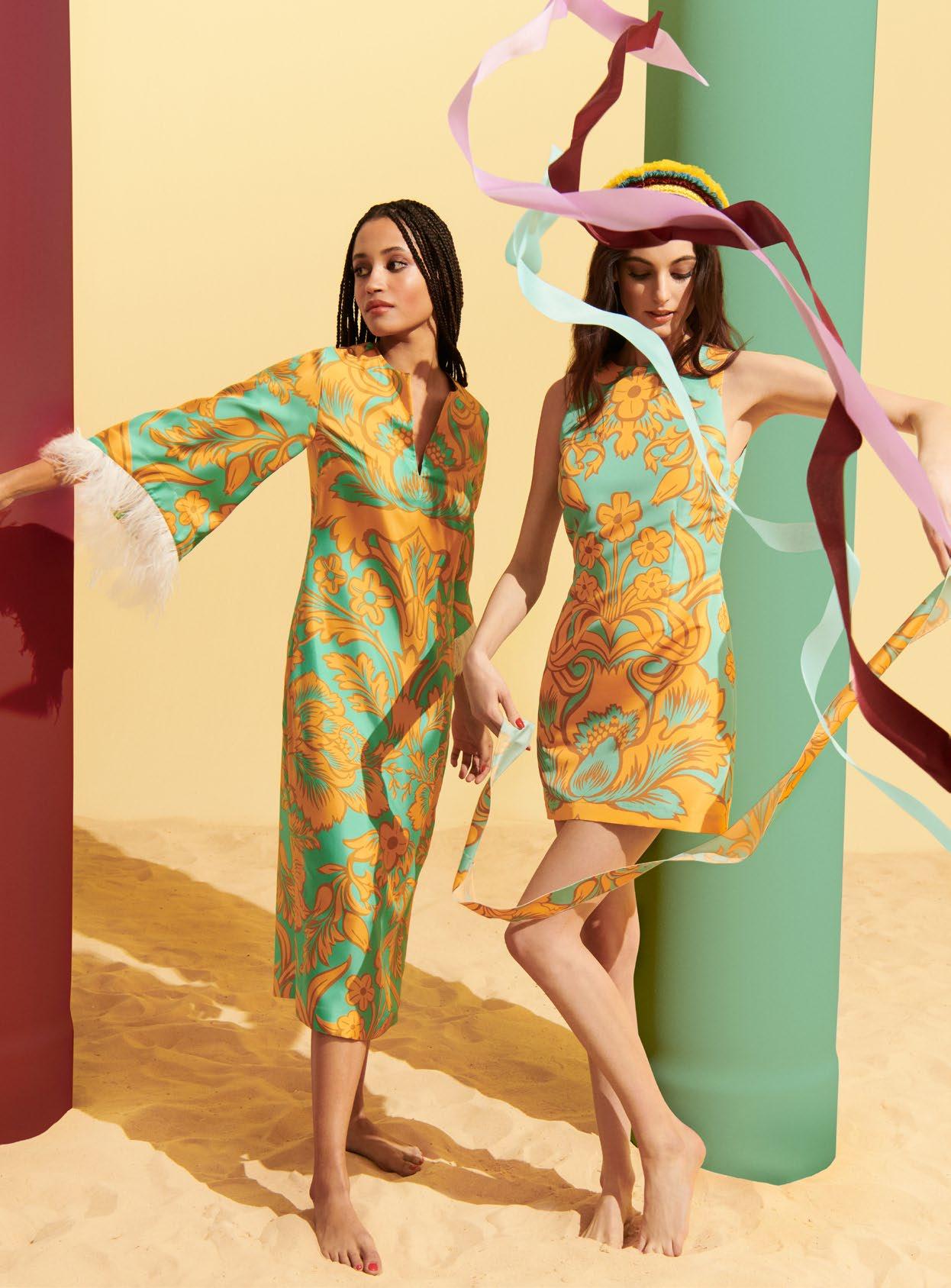 THE KAFTAN SHOT COTTON - PIGMY PALM VENEZIANA FLATS TWILL - ZIA EVE BLOUSE CREPE DE CHINE - ZIA LUNGOMARE SKIRT CREPE DE CHINE - ZIA MEDAL SANDAL TWILL - MOONFLOWER