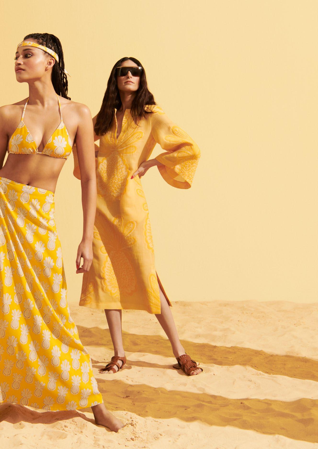 TRIANGLE BIKINI TOP LYCRA - PINEAPPLE SUNFLOWER FLIPPER SKIRT SABLÉ - PINEAPPLE SUNFLOWER THE KAFTAN JACQUARD PINEAPPLE LACE