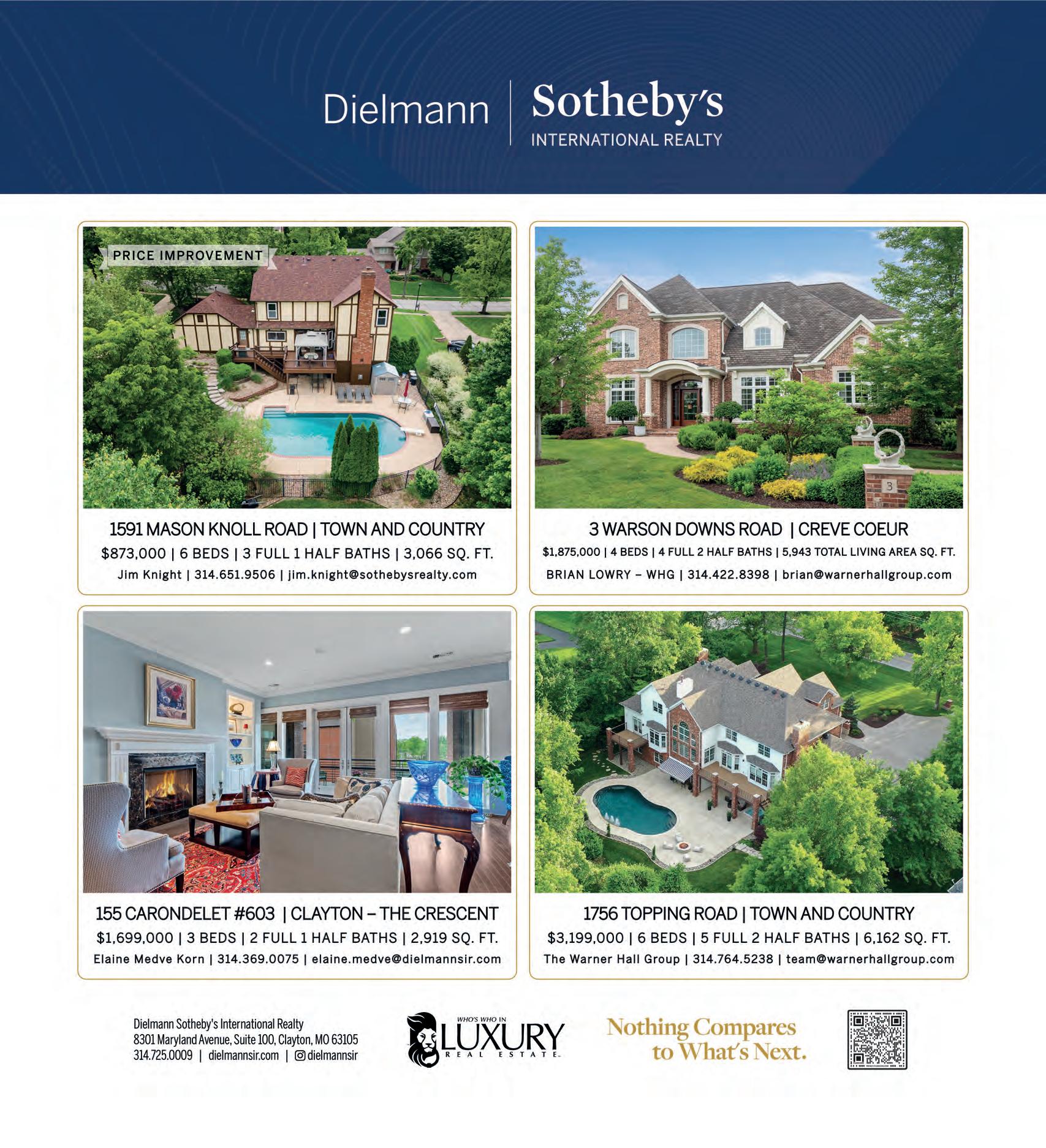 Ridge Crest Drive Chesterfield•$1,829,000 4Bedrooms•3Full&2HalfBaths 2150 Wakefield Bluff Cour t Wildwood•$1,165,000 4Bedrooms•3Full&1HalfBaths 1323 Bloomfield Drive Eureka•$550,000 3Bedrooms•2FullBaths