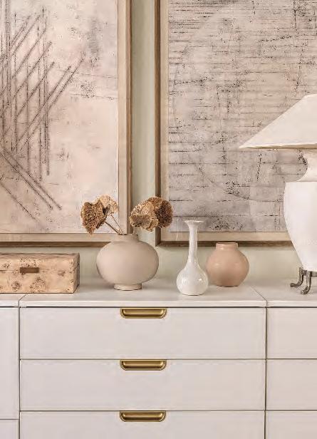 Proper placement of avignettedependson theroom’ssightlinesand features.Vignettescanadd interesttoentryways,coffee tablesandbookshelvesor highlightaspecificheirloom orartwork.“Whenyou walkintoaroomandthere isawell-definedfocalwalloranarchitecturaldetailyouwantto highlight,thenthosearegreatopportunitiesforavignette,”McCoy says.“Sometimesaquietmomentonanendtableornightstandis anopportunitytocreateavignettethattellsastoryaswell.”